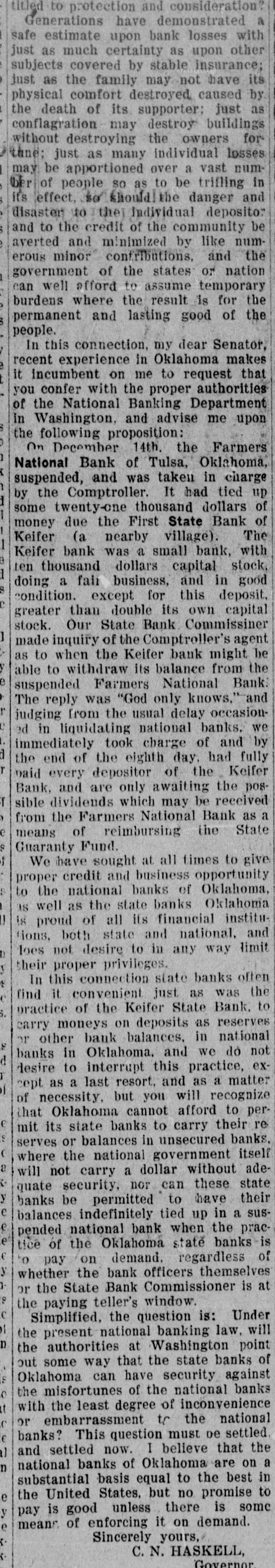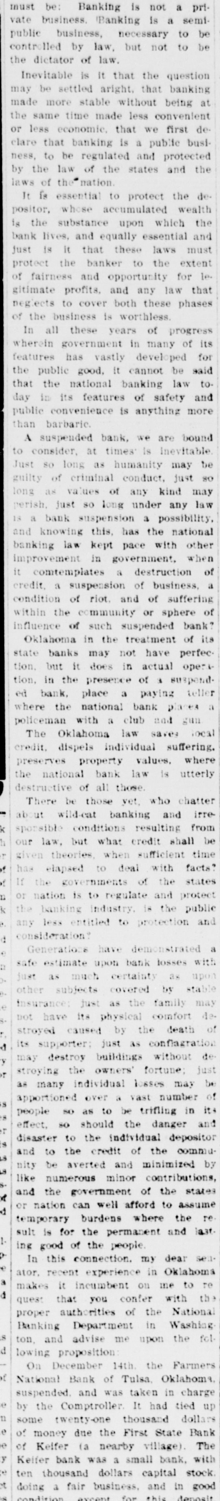 minor contributions, and th vernment of the states or natio well afford to assume temporar where the result is for th rmanent and lasting good of th ople. this connection, my dear Senato experience in Oklahoma make incumbent on me to request tha confer with the proper authoritie the National Banking Departmen Washington, and advise me upo following proposition: December 14th. the Farmer ational Bank of Tulsa, Oklahoma spended, and was taken in charg the Comptroller. It had tied u twenty-one thousand dollars o due the First State Bank o eifer (a nearby village). Th eifer bank was a small bank, wit thousand dollars capital stocl a fair business, and in goo ndition. except for this deposi eater than double its own capita Our State Bank Commissine inquiry of the Comptroller's ager to when the Keifer bank might li to withdraw its balance from th spended Farmers National Banl reply was "God only knows," an dging from the usual delay occasion in liquidating national banks. w imediately took charge of and b end of the eighth day. had full every depositor of the Keife and are only awaiting the po dividends which may be receive the Farmers National Bank as of reimbursing the Stat naranty Fund. We have sought at all times to giv credit and business opportunit the national banks of Oklahom well as the state banks Oklahom proud of all its financial instit both state and national, an not desire to in any way Iim proper privileges. In this connection state banks ofte it convenient just as was th actice of the Keifer State Bank. I moneys on deposits as reserve other bank balances, in nation in Oklahoma. and we do ne to interrupt this practice, e as a last resort, and as a matte necessity, but you will recogniz Oklahoma cannot afford to pe its state banks to carry their r or balances in unsecured bank here the national government itse not carry a dollar without ad security, nor can these stat be permitted to have the alances indefinitely tied up in a su ended national bank when the pra of the Oklahoma state banks pay on demand. regardless ( hether the bank officers themselve the State Bank Commissioner is : paying teller's window. Simplified, the question is: Unde present national banking law, wi authorities at Washington poir some way that the state banks . klahoma can have security agains