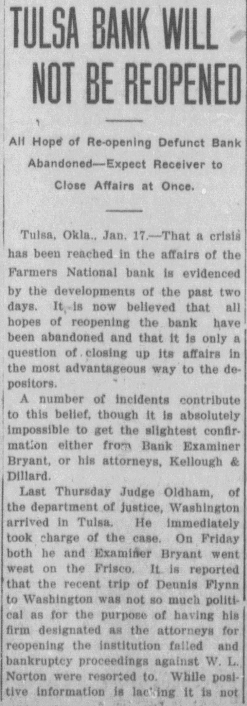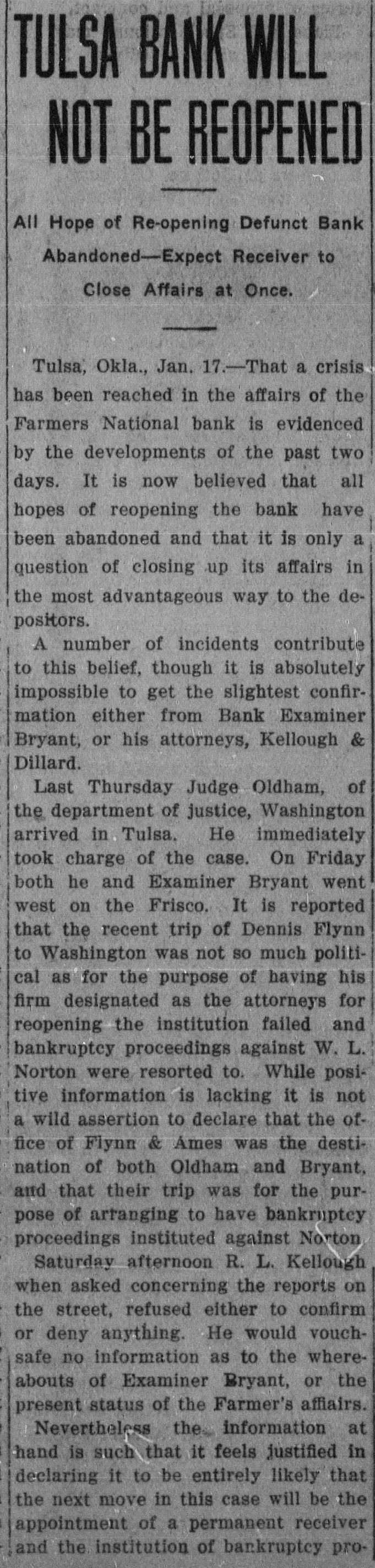 TULSA BANK WILL NOT BE REOPENED All Hope of Re-opening Defunct Bank Abandoned-Expect Receiver to Close Affairs at Once. Tulsa, Okla., Jan. 17.-That a crisis has been reached in the affairs of the Farmers National bank is evidenced by the developments of the past two days. It is now believed that all hopes of reopening the bank have been abandoned and that it is only a question of closing up its affairs in the most advantageous way to the depositors. A number of incidents contribute to this belief, though it is absolutely impossible to get the slightest confirmation either from Bank Examiner Bryant, or his attorneys, Kellough & Dillard. Last Thursday Judge Oldham, of the department of justice, Washington arrived in Tulsa. He immediately took charge of the case. On Friday both he and Examiner Bryant went west on the Frisco. It is reported that the recent trip of Dennis Flynn to Washington was not so much political as for the purpose of having his firm designated as the attorneys for reopening the institution failed and bankruptcy proceedings against W. L. Norton were resorted to, While positive information is lacking it is not
