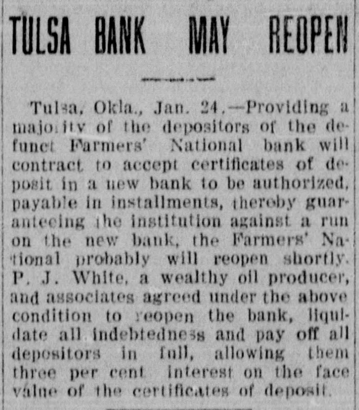TULSA BANK MAY REOPE Tulsa, Okla., Jan. 24.-Providing a majority of the depositors of the defunet Farmers' National bank will contract to accept certificates of deposit in a new bank to be authorized. payable in installments, thereby guaranteeing the institution against a run on the new bank, the Farmers' National probably will reopen shortly. P. J. White, a wealthy oil producer, and associates agreed under the above condition to reopen the bank, liquidate all indebtedness and pay off all depositors in full, allowing them three per cent interest on the face value of the certificates of deposit.