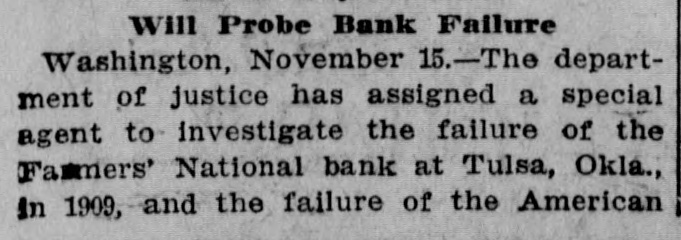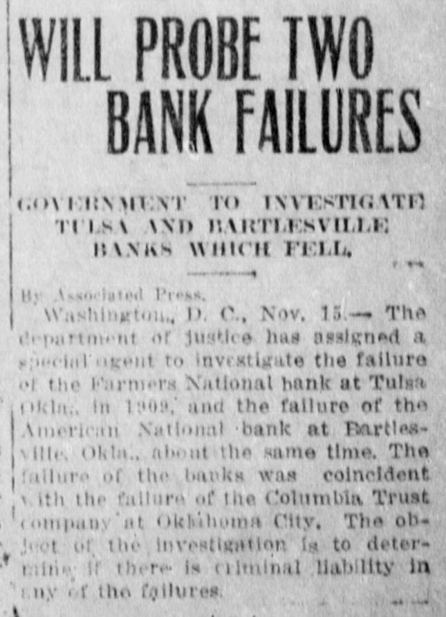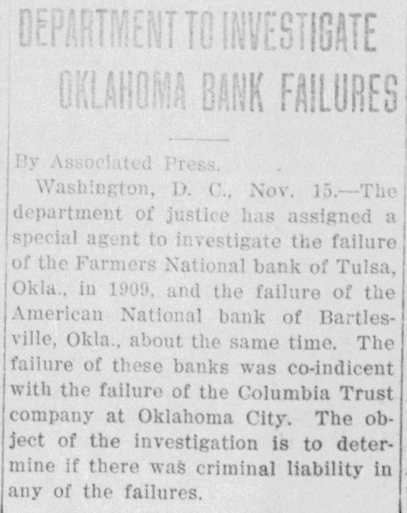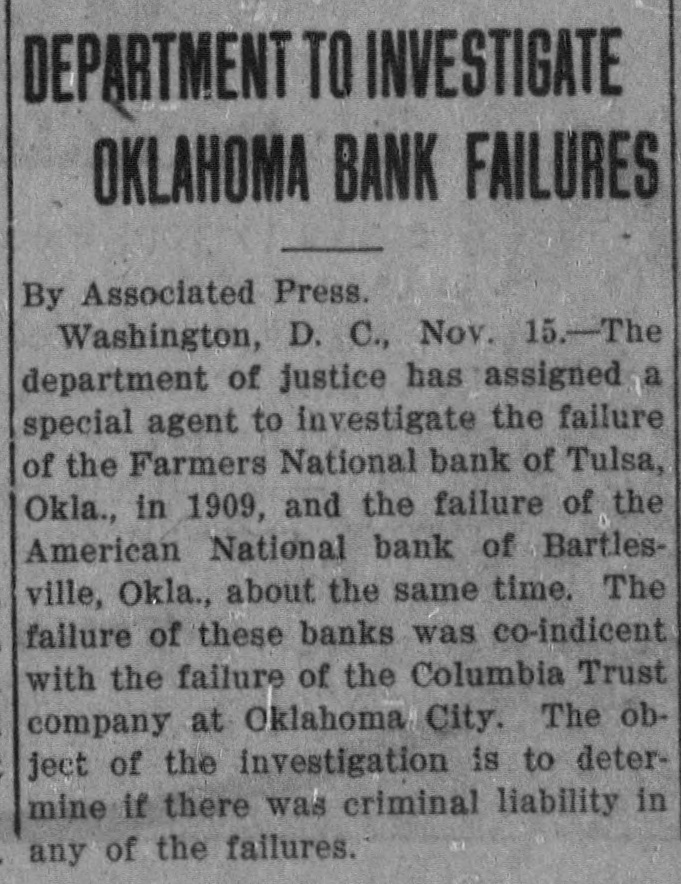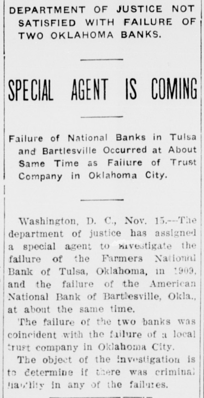 DEPARTMENT OF JUSTICE NOT SATISFIED WITH FAILURE OF TWO OKLAHOMA BANKS. SPECIAL AGENT IS COMING Failure of National Banks in Tulsa and Bartlesville Occurred at About Same Time as Failure of Trust Company in Oklahoma City. Washington, D. C., Nov. 15.--The department of justice has assigned a special agent to revestigate the failure of the Farmers National Bank of Tulsa, Oklahoma, in 1909, and the failure of the American National Bank of Bartlesville, Okla., at about the same time. The failure of the two banks was coincident with the failure of a local trust company in Oklahoma City. The object of the investigation is to determine if there was criminal liability in any of the failures.