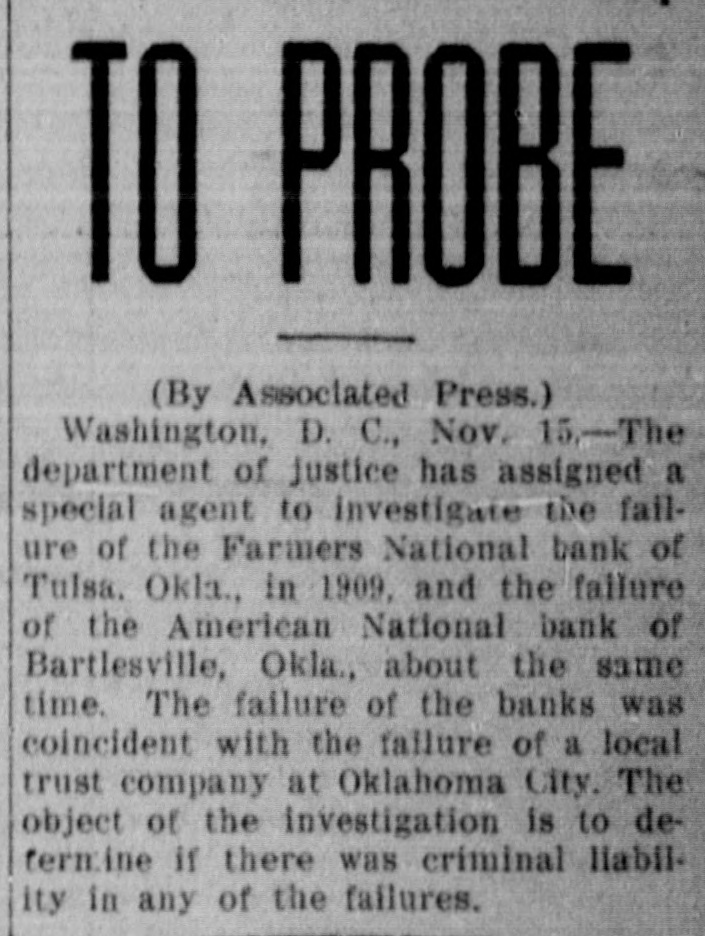 TO PROBE (By Associated Press.) Washington, D. C., Nov. 15-The department of justice has assigned a special agent to investigate the failure of the Farmers National bank of Tulsa. Okla., in 1909, and the failure of the American National bank of Bartlesville, Okla., about the same time. The failure of the banks was coincident with the failure of a local trust company at Oklahoma City, The object of the investigation is to determine if there was criminal liability in any of the failures.
