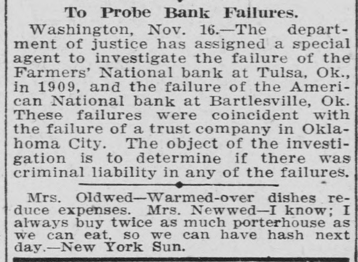 To Probe Bank Failures. Washington, Nov. 16.-The department of justice has assigned a special agent to investigate the failure of the Farmers' National bank at Tulsa, Ok., in 1909, and the failure of the American National bank at Bartlesville, Ok. These failures were coincident with the failure of a trust company in Oklahoma City. The object of the investigation is to determine if there was criminal liability in any of the failures. Mrs. Oldwed-Warmed-over dishes reduce expenses. Mrs. Newwed-I know; I always buy twice as much porterhouse as we can eat, so we can have hash next day.-New York Sun.