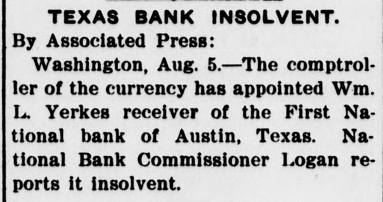 TEXAS BANK INSOLVENT. By Associated Press: Washington, Aug. 5.-The comptroller of the currency has appointed Wm. L. Yerkes receiver of the First National bank of Austin, Texas. National Bank Commissioner Logan reports it insolvent.