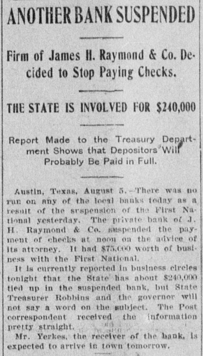 ANOTHER BANK SUSPENDED Firm of James II. Raymond & Co. Decided to Stop Paying Checks. THE STATE IS INVOLVED FOR $240,000 Report Made to the Treasury Department Shows that Depositors Will Probably Be Paid in Full. Austin, Texas, August 5. -There was no run on any of the local banks today as a result of the srspension of the First National yesterday. The private bank of J. H. Raymond & Co. suspended the payment of checks at noon on the advice of its attorney. It had $75,000 worth of business with the First National. It is currently reported in business circles tonight that the State has about $240,000 tied up in the suspended bank, but State Treasurer Robbins and the governor will not say a word on the subject. The Post correspondent received the information pretty straight. Mr. Yerkes, the receiver of the bank, is expected to arrive in town tomorrow.