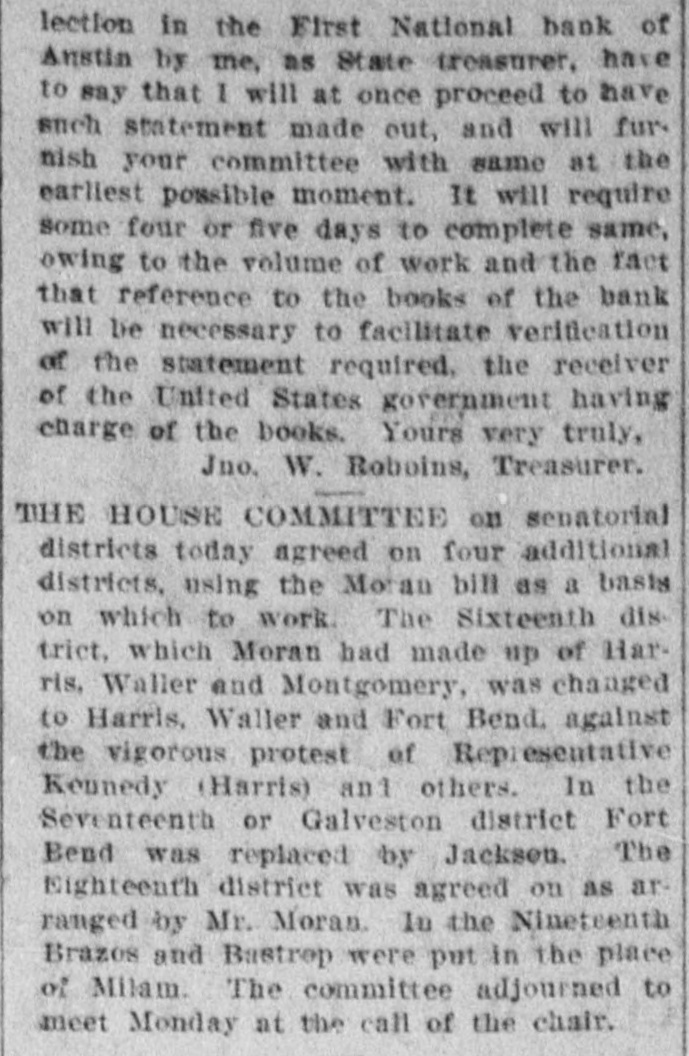 lection in the First National bank of Anstin by me, as State treasurer, have to say that I will at once proceed to have such statement made out, and will fur. nish your committee with same at the earliest possible moment. It will require some four or five days to complete same, owing to the volume of work and the fact that reference to the books of the bank will be necessary to facilitate verification of the statement required, the receiver of the United States government having charge of the books. Yours very truly, Jno. W. Roboins, Treasurer. THE HOUSE COMMITTEE on senatorial districts today agreed on four additional districts, using the Moran bill as a basis on which to work. The Sixteenth district, which Moran had made up of Harris, Waller and Montgomery, was changed to Harris, Waller and Fort Bend. against the vigorous protest of Representative Kennedy (Harris) and others. In the Seventeenth or Galveston district Fort Bend was replaced by Jackson. The Eighteenth district was agreed on as arranged by Mr. Moran. In the Nineteenth Brazos and Bastrop were put in the place of Milam. The committee adjourned to meet Monday at the call of the chair.