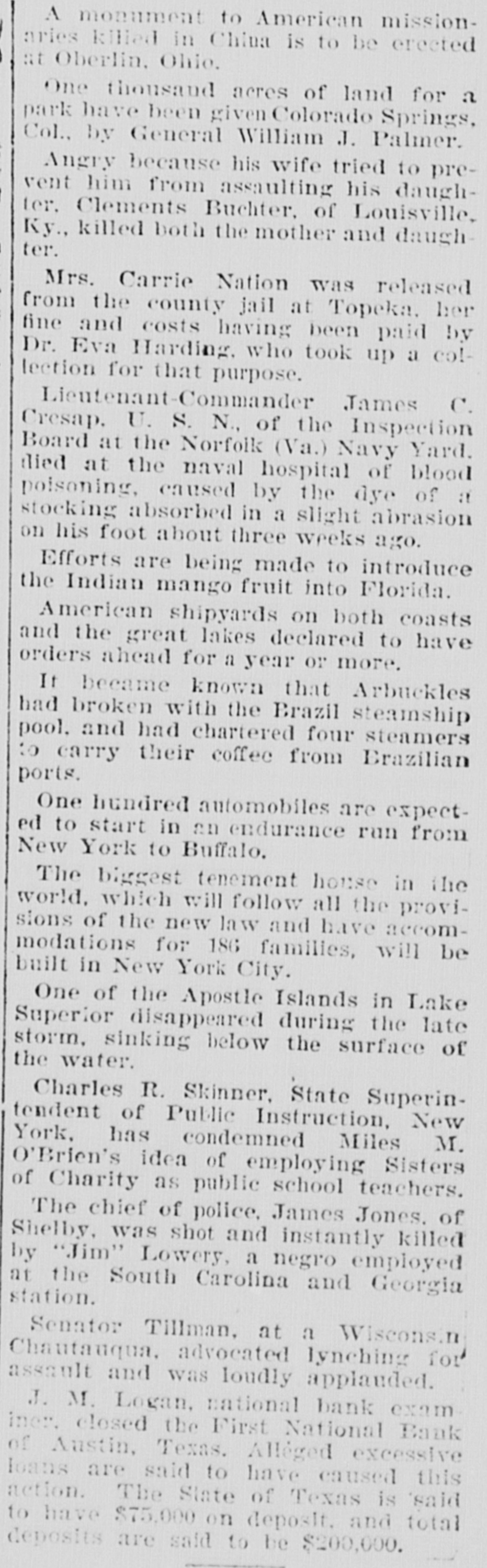 A montment to American missionaries killed in China is to be erected at Oberlin, Ohio. One thousand acres of land for a park have been given Colorado Springs, Col., by General William J. Palmer. Angry because his wife tried to prevent him from assaulting his daughter. Clements Buchter, of Louisville, Ky., killed both the mother and daughter. Mrs. Carrie Nation was released from the county jail at Topeka. her fine and costs having been paid by Dr. Eva Harding, who took up a collection for that purpose. Lieutenant-Commander James C. Cresap. U. S. N., of the Inspection Board at the Norfoik (Va.) Navy Yard. flied at the naval hospital of blood poisoning, caused by the dye of a stocking absorbed in a slight abrasion on his foot about three weeks ago. Efforts are being made to introduce the Indian mango fruit into Florida. American shipyards on both coasts and the great lakes declared to have orders ahead for a year OF more. It became known that Arbuckles had broken with the Brazil steamship pool. and had chartered four steamers :0 carry their coffee from Brazilian ports. One hundred automobiles are expected to start in an endurance run from New York to Buffalo. The biggest tenement house in the world. which will follow all the provisions of the new law and have accommodations for 186 families, will be built in New York City. One of the Apostic Islands in Lake Superior disappeared during the late storm. sinking below the surface of the water. Charles R. Skinner. State Superintendent of Public Instruction, New York, has condemned Miles M. O'Brien's idea of employing Sisters of Charity as public school teachers. The chief of police, James Jones. of Shelby, was shot and instantly killed by "Jim" Lowery, a negro employed at the South Carolina and Georgia station. Senator Tillman, at a Wiscons.n Chautauqua, advocated lynching for assault and was loudly applauded. J. M. Logan, national bank exam inc. closed the First National Bank of Austin, Texas. AllΓ©ged excessive loans are said to have caused this action. The State of Texas is said to have $75,000 on deposit. and total deposits are said to be $200,000.
