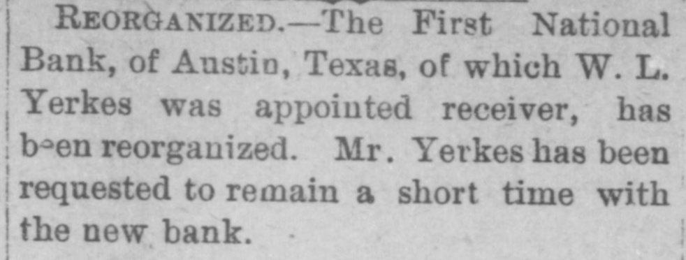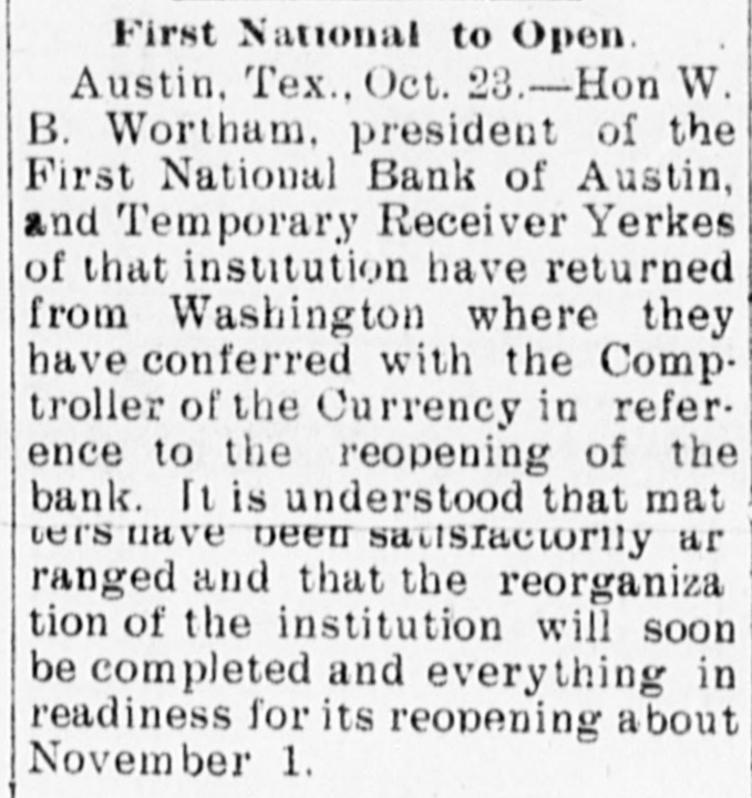 ing notice was posted on the doors of the First National bank at 4 o'clock this afternoon: This bank is closed and in my hands as agent pending the arrival of William L. Yerkes, special examiner, who has been appointed temporary receiver by the comptroller of the currency. J. H. Logan, National Bank Examiner. The closing of the bank created a sensation in business circles and within an hour after the notice was put up a large crowd of citizens had assembled in front of the bank and were discussing the situation. Of course all sorts of rumors are in circulation as to the cause of the closing. W. B. Wortham is president of the bank and he is out of the city, either in New York or Buffalo. One of his brothers stated this evening that he thought he was on his way home. The other officers of the bank are J. S. Myrick, vice president; Hermann Pfaef flin, cashier. Other directors are J. P. Lawless and Mrs. J. H. Raymond. This is the first bank failure which has occured in Austin for thitry years. State Treasurer Robbins and Secretary Tod do business for the State through the bank, and when seen by The Post man this evening Mr. Robbins said that he and Mr. Tod would make a statement to the governor in the morning. Otherwise he refused to talk. He said, however, that the bank attended to collections for him and when asked if the amount deposited was $50,000, he said it was more than that. The bank officials decline to give out any information whatever and Mr. Logan also refuses to say anything. It is believed that there is enough cash in the vault to pay all depositors in full. It was learned this evening that there has been a quiet withdrawal of funds by the depositors for the past ten days. President W. B. Wortham wired tonight from Buffalo as soon as he learned of his bank being closed that he would be home Wednesday. There is very little apprehension on the part of large depositors. Cashier Pfaefflin has been confined to his home dangerously ill since Friday night. The collections from the secretary of State's department in the hands of the bank will not exceed $3000. It is understood that the State treasurer collects all checks sent him as remittances on land accounts through the First National, as has been the custom for over twenty years. This course has been made necessary because of the variety and nature of the remittances. all being bank or personal checks on distant points. Owing to a large amount in course of collection.