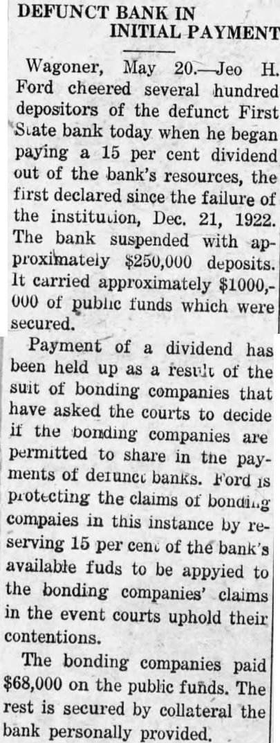 DEFUNCT BANK IN INITIAL PAYMENT Wagoner, May 20.-Jeo H. Ford cheered several hundred depositors of the defunct First State bank today when he began paying a 15 per cent dividend out of the bank's resources, the first declared since the failure of the institution, Dec. 21, 1922. The bank suspended with approximately $250,000 deposits. It carried approximately $1000,000 of public funds which were secured. Payment of a dividend has been held up as a result of the suit of bonding companies that have asked the courts to decide if the bonding companies are permitted to share in the payments of defunct banks. Ford IS protecting the claims of bonding compaies in this instance by reserving 15 per cent of the bank's available fuds to be appyied to the bonding companies' claims in the event courts uphold their contentions. The bonding companies paid $68,000 on the public funds. The rest is secured by collateral the bank personally provided.