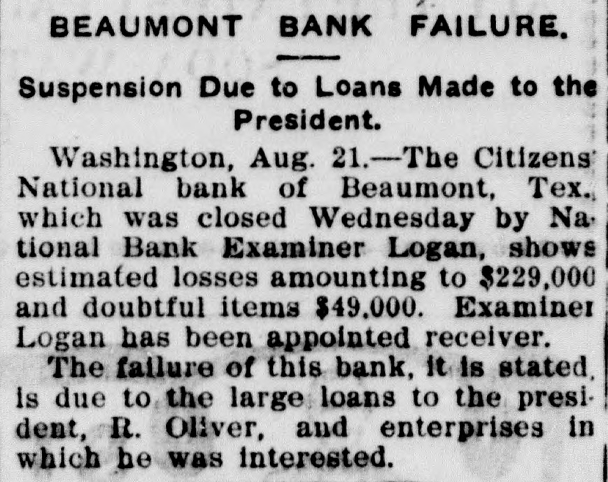 TEXAS BANK LOANED MONEY TO PRESIDENT Results in Losses, and Comptroller of Currency Takes Charge. The Comptroller of the Currency announced today that the Citizens' National Bank, of Beaumont, Texas, was closed yesterday after examination by National Bank Examiner J. M. Logan, and a committee of the Clearing House Association, which showed estimated losses amounting to $229,000, and doubtful items of $49,000. Examiner Logan has been appointed receiver. The failure of this bank is due to the large loans made to the president, R. Oliver, and enterprises in which he is interested.