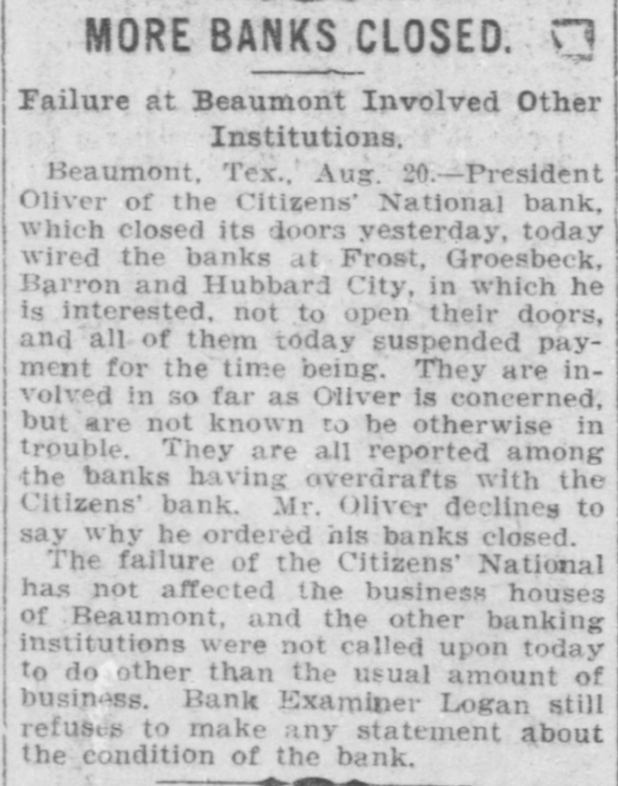 MORE BANKS CLOSED. Failure at Beaumont Involved Other Institutions. Beaumont, Tex., Aug. 20.-President Oliver of the Citizens' National bank, which closed its doors yesterday, today wired the banks at Frost, Groesbeck, Barron and Hubbard City, in which he is interested, not to open their doors, and all of them today suspended payment for the time being. They are involved in so far as Oliver is concerned, but are not known to be otherwise in trouble. They are all reported among the banks having overdrafts with the Citizens' bank. Mr. Oliver declines to say why he ordered his banks closed. The failure of the Citizens' National has not affected the business houses of Beaumont, and the other banking institutions were not called upon today to do other than the usual amount of business. Bank Examiner Logan still refuses to make any statement about the condition of the bank.