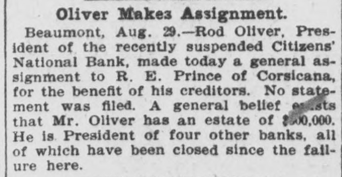 Oliver Makes Assignment. Beaumont, Aug. 29.-Rod Oliver, President of the recently suspended Citizens' National Bank, made today a general assignment to R. E. Prince of Corsicana, for the benefit of his creditors. No statement was filed. A general belief esists that Mr. Oliver has an estate of $00,000. He is President of four other banks, all of which have been closed since the fallure here.