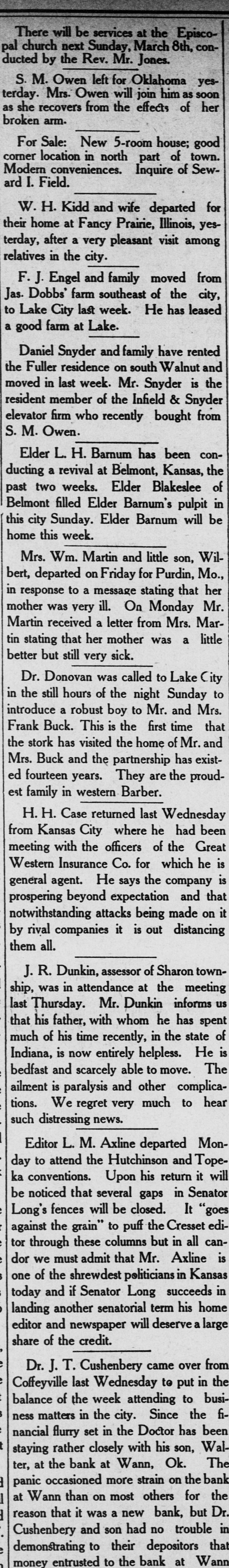 There will be services at the Episcopal church next Sunday, March 8th, conducted by the Rev. Mr. Jones. S. M. Owen left for Oklahoma yesterday. Mrs. Owen will join him as soon as she recovers from the effects of her broken arm. For Sale: New 5-room house; good corner location in north part of town. Modem conveniences. Inquire of Seward I. Field. W. H. Kidd and wife departed for their home at Fancy Prairie, Illinois, yesterday, after a very pleasant visit among relatives in the city. F. J. Engel and family moved from Jas. Dobbs' farm southeast of the city, to Lake City last week. He has leased a good farm at Lake. Daniel Snyder and family have rented the Fuller residence on south Walnut and moved in last week. Mr. Snyder is the resident member of the Infield & Snyder elevator firm who recently bought from S.M.Owen. Elder L. H. Barnum has been conducting a revival at Belmont, Kansas, the past two weeks. Elder Blakeslee of Belmont filled Elder Barnum's pulpit in this city Sunday. Elder Barnum will be home this week. Mrs. Wm. Martin and little son, Wilbert, departed on Friday for Purdin, Mo., in response to a message stating that her mother was very ill. On Monday Mr. Martin received a letter from Mrs. Martin stating that her mother was a little better but still very sick. Dr. Donovan was called to Lake City in the still hours of the night Sunday to introduce a robust boy to Mr. and Mrs. Frank Buck. This is the first time that the stork has visited the home of Mr. and Mrs. Buck and the partnership has existed fourteen years. They are the proudest family in western Barber. H. H. Case returned last Wednesday from Kansas City where he had been meeting with the officers of the Great Western Insurance Co. for which he is general agent. He says the company is prospering beyond expectation and that notwithstanding attacks being made on it by rival companies it is out distancing them all. J. R. Dunkin, assessor of Sharon township, was in attendance at the meeting last Thursday. Mr. Dunkin informs us that his father, with whom he has spent much of his time recently, in the state of Indiana, is now entirely helpless. He is bedfast and scarcely able to move. The ailment is paralysis and other complications. We regret very much to hear such distressing news. Editor L. M. Axline departed Monday to attend the Hutchinson and Topeka conventions. Upon his return it will be noticed that several gaps in Senator Long's fences will be closed. It "goes against the grain" to puff the Cresset editor through these columns but in all candor we must admit that Mr. Axline is one of the shrewdest politicians in Kansas today and if Senator Long succeeds in landing another senatorial term his home editor and newspaper will deserve a large share of the credit. Dr. J. T. Cushenbery came over from Coffeyville last Wednesday to put in the balance of the week attending to business matters in the city. Since the financial flurry set in the Doctor has been staying rather closely with his son, Walter, at the bank at Wann, Ok. The panic occasioned more strain on the bank at Wann than on most others for the reason that it was a new bank, but Dr. Cushenbery and son had no trouble in demonstrating to their depositors that money entrusted to the bank at Wann