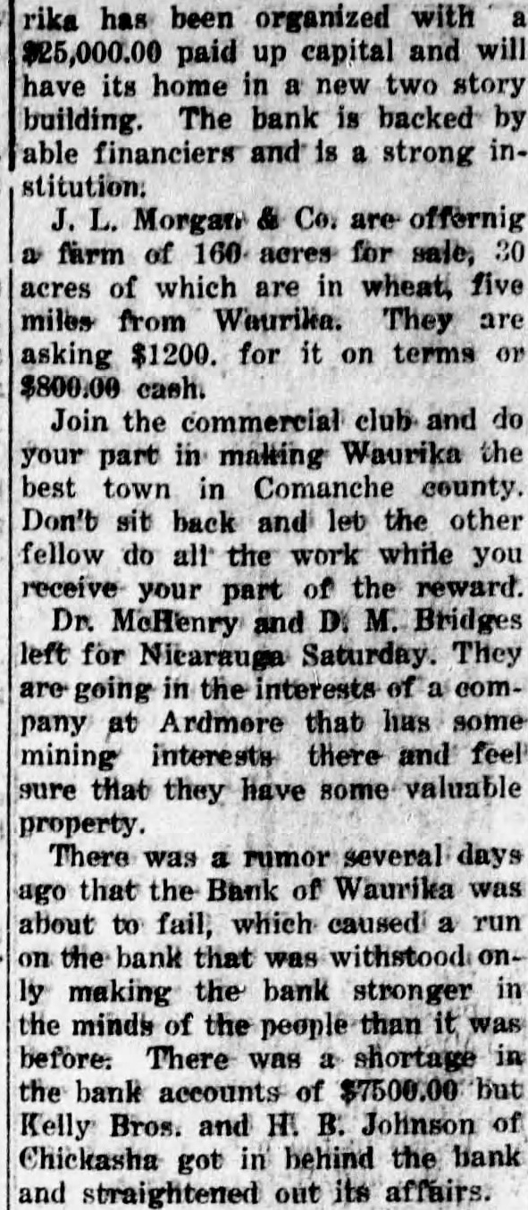 rika has been organized with $25,000.00 paid up capital and will have its home in new two story building. The bank is backed by able financiers and a strong institution. J. Morgan Co. are offernig farm of 160 acres for sale, 30 acres of which are in wheat, five miles from Waurika. They are asking $1200. for it on terms or $800.00 cash. Join the commercial club and do your part in making Waurika the best town in Comanche county. Don't sit back and leb the other fellow do all' the work while you receive your part of the reward. Dr. McHenry and D. M. Bridges left for Nicarauga Saturday. They are going in the interests of company at Ardmore that has some mining interests there and feel sure that they have some valuable property. There was rumor several days ago that the Bank of Waurika was about to fail, which caused run on the bank that was withstood making the bank stronger in the minds the people it was before. There was a shortage in the bank accounts of $7500.00 but Kelly Bros. and H. B. Johnson of Chickasha got in behind the bank and straightened out its affairs.