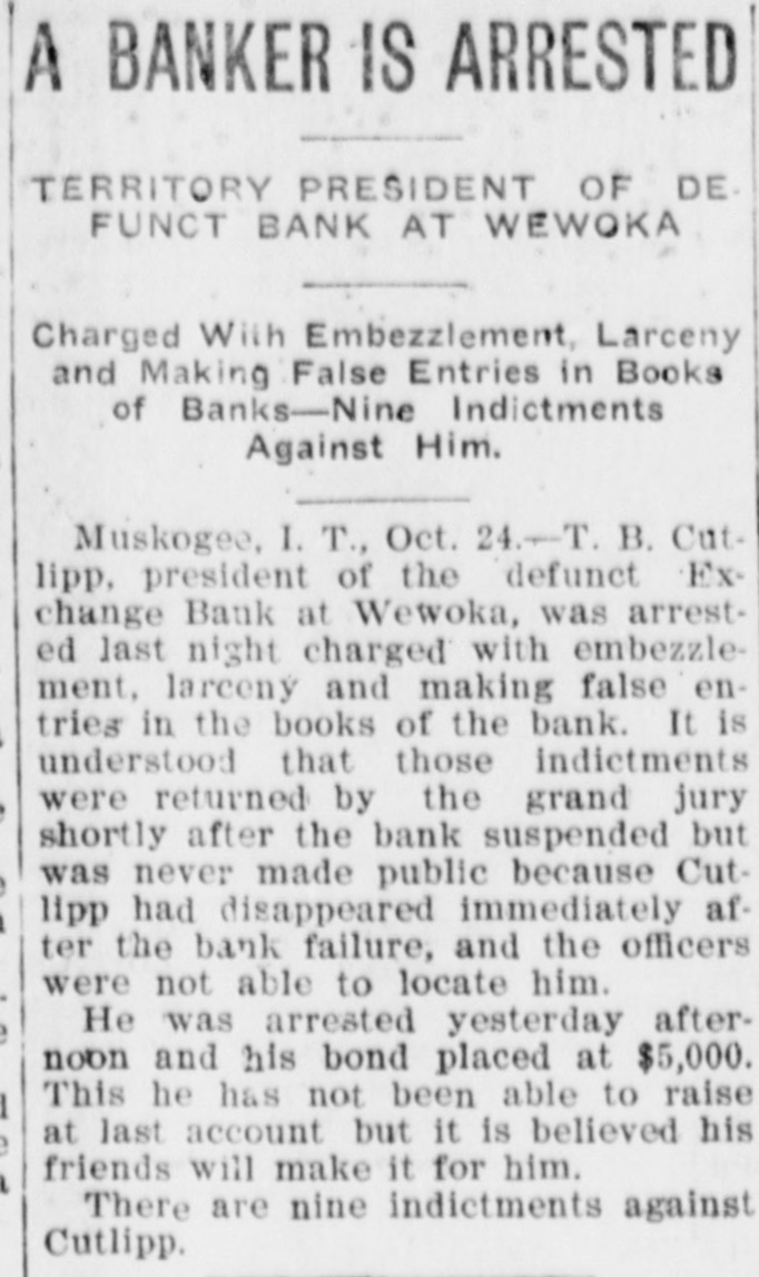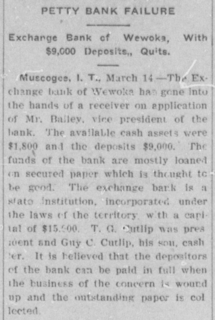 PETTY BANK FAILURE Exchange Bank of Wewoka, With $9,000 Deposits,, Quits. Muscogee, 1. T., March 14-The Exchange bank of Wewoka has gone into the hands of a receiver on application of Mr. Bailey, vice president of the bank. The available cash assets were $1,800 and the deposits $9,000. The funds of the bank are mostly loaned on secured paper which is thought to be good. The exchange bank is a state institution, incorporated under the laws of the territory with a capital of $15.000. T. G. Cutlip was pres ident and Guy C. Cutlip, his son, cash er. It is believed that the depositors of the bank can be paid in full when the business of the concern is wound up and the outstanding paper is col lected.