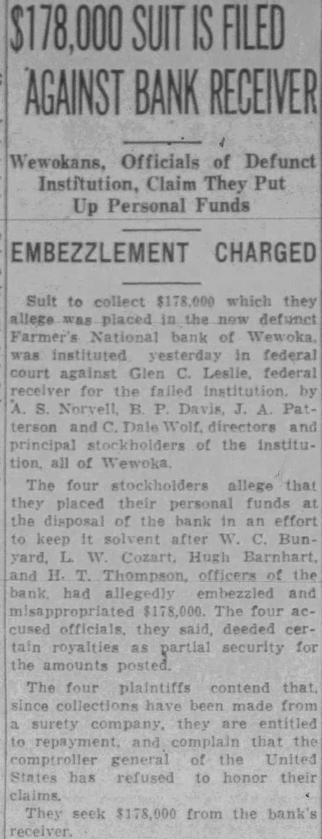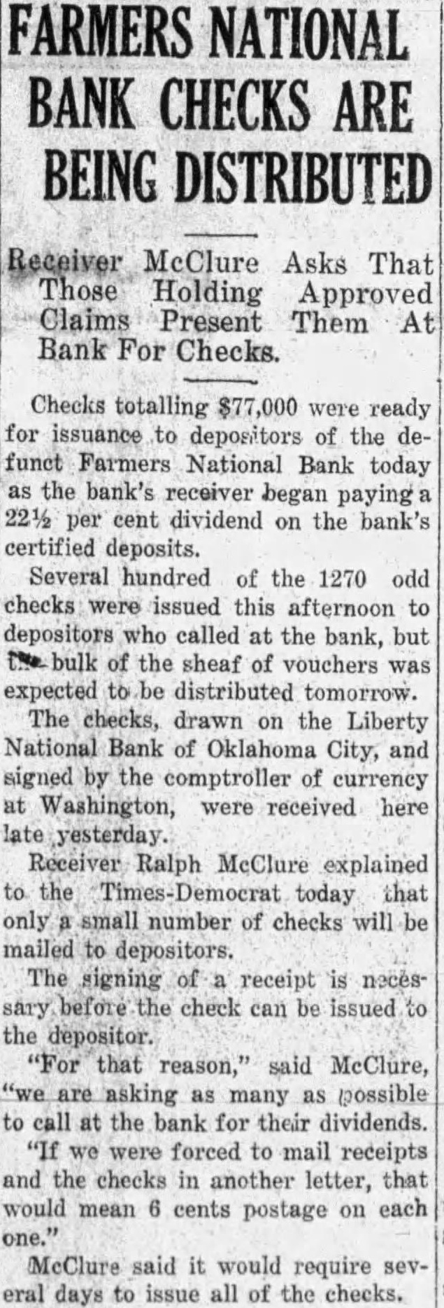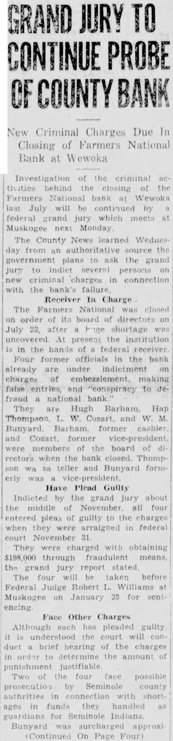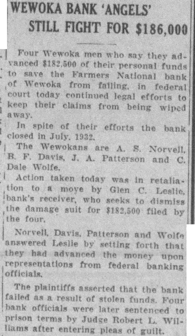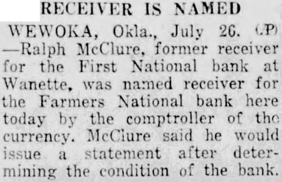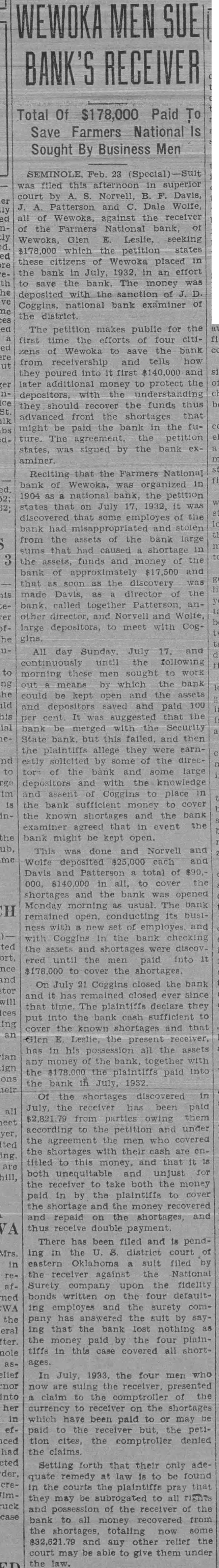 When the Farmers National bank was closed, Seminole county had on deposit approximately $155,000. secured by securities pledged to the county by the bank amounting to about $175,000 There was some irregularity about the pledge, and the law was not quite clear on the matter To start lawsuit would open a period of litigation that might have taken years to decide, and so no action was taken until the supreme court of the United States had held that where state law permits a state bank to pledge securities for funds, such as those deposited by counties, municipalities and similar subdivisions under the banking law of 1930 a national bank, too, is au thorized to do the same. With this decision to strengthen their plea the five citizens left Wewoka last week to personally contact the comptroller of the currency to get release of the county funds, to hasten the declaration of another dividend by the bank and its liquidation