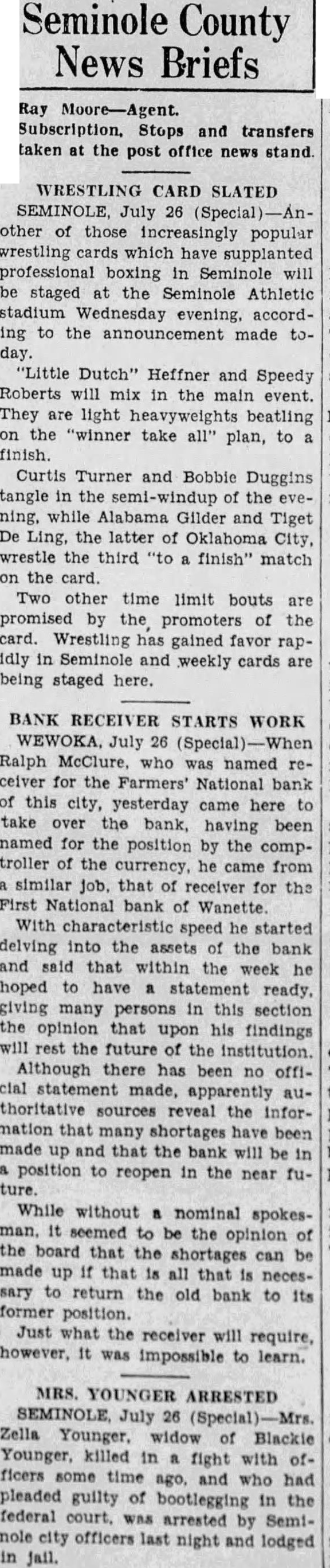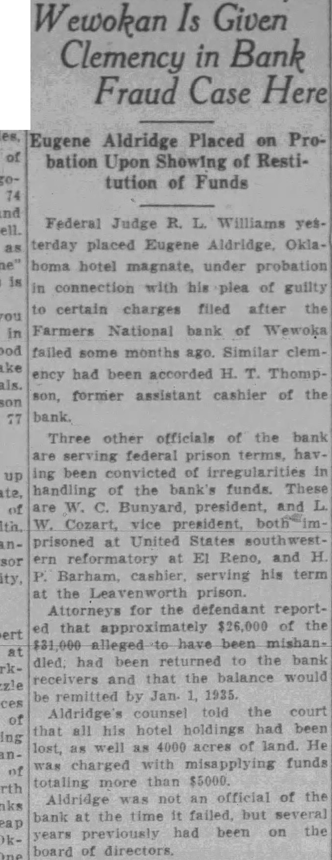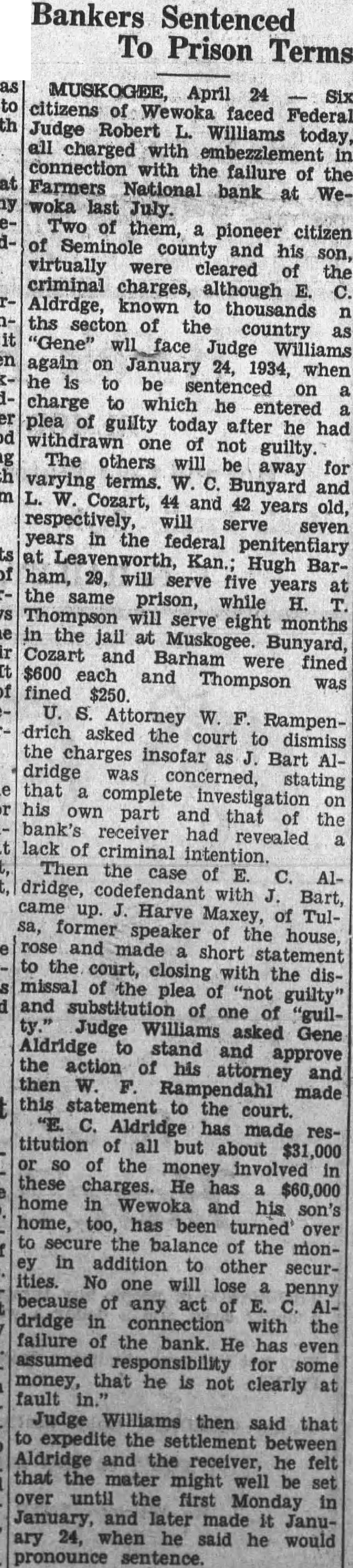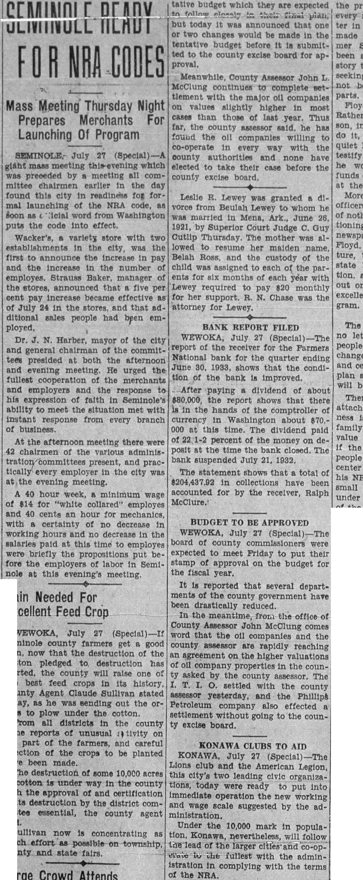 When the Farmers National bank was closed, Seminole county had on deposit approximately $155,000. secured by securities pledged to the county by the bank amounting to about $175,000 There was some irregularity about the pledge, and the law was not quite clear on the matter To start lawsuit would open a period of litigation that might have taken years to decide, and so no action was taken until the supreme court of the United States had held that where state law permits a state bank to pledge securities for funds, such as those deposited by counties, municipalities and similar subdivisions under the banking law of 1930 a national bank, too, is au thorized to do the same. With this decision to strengthen their plea the five citizens left Wewoka last week to personally contact the comptroller of the currency to get release of the county funds, to hasten the declaration of another dividend by the bank and its liquidation