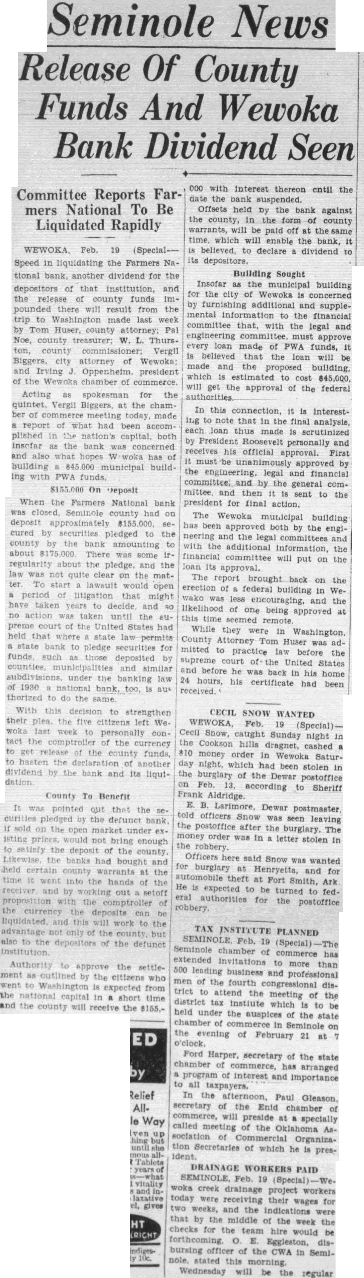 WEWOKA. Feb. 19 (Special--Speed in liquidating the Farmers National bank, another dividend for the depositors of that institution, and the release of county funds impounded there will result from the trip to Washington made last week by Tom Huser, county attorney: Pal Noe, county treasurer: W. L. Thurston, county commissioner; Vergil Biggers. city attorney of Wewoka: and Irving J. Oppenheim, president of the Wewoka chamber of commerce. Acting as spokesman for the quintet, Vergil Biggers, at the chamber of meeting today, made a report of what had been accomplished in the nation's capital, both insofar the bank was concerned and also what hopes W woka has of building $45.000 municipal building with PWA funds. $155,000 On Deposit