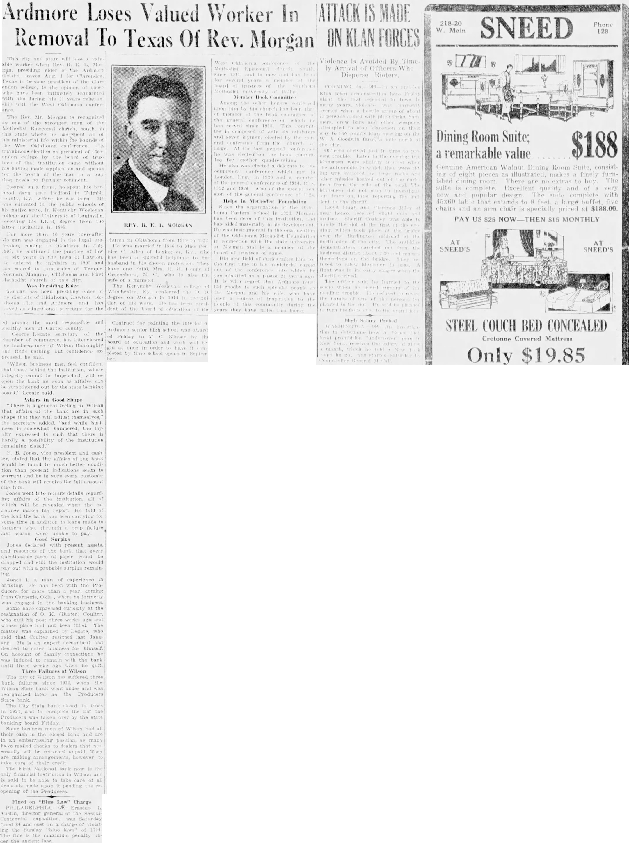 Ardmore Loses Valued Worker In ATTACK IS MADE ON KLAN FORCES Removal To Texas Of Rev. Morgan This city and state lose able worker when Rev R E. 1. Mor Texas to become president of the Clarendon college is the opinion of those have been Intimately acquainted with him during his 21 years relation ship the West Oklahoma confer The Rev Mr. Morgan is recognized is of the strongest men of the this state where all his ministerial life within the bounds of the West Oklahoma conference. His unanimous election as president of Clar endon by the board of trus tees of that Institution came without his having made application and speaks for the worth of the man a WAS that no further comment Reared on farm he spent his boy hood days near Redford in Trimble educated in the public schools of his native state. in Kentucky Wesleyan ollege and the "niversity of Louisville his LL.B. degree from the latter Institution in 1895 For more than 10 years thereafter Morgan was engaged in the legal pro ession, coming to Oklahoma in July 005. he continued the practice of law six years in the town of Lawton to entered the ministry In 1905 and served in pastorates at Temple Norman Mangum Chickasha and First dethodist church of this city Was Presiding Elder Morgan has been presiding older districts of Oklahoma, Lawton OKhoma City and Ardmore and has erved as educational secretary for the hurch in Oklahoma from 1919 to 1922 He WILS married in 1896 to Miss Ber been splendid helpmate to her husband in his chosen profes They have child, Mrs R. Honry Greensboro, N. C., who is also th wife of minister The Kentucky Wesleyan college Ky conferred the D degree on Morgan In 1914 in dent of the board of education of the West Methodist Episcopal south since now and has for years member Methodist university Member Book Committee honors of member the the general has served since 1918 This commit elected by the eral from the church large At last general tee for another quadrennium, ecumentcal conference which met of the general conferences of 1914 1018 1922 and 1926 of the special sion the general Helps in Methodist Foundation Strice the organization or the has been dean of this Institution or the Oklahoma Methodist Foundation in connection with the state at Norman and member the of beard of trustees of same new field of duties for the first time in his ministerial career of which years It is with regret that Ardmore goodby splendid people Dr Morgan and his people of this community during the they have called this home among the most responsible and wealthy men of Carter county George Legate, of the hamber of commerce, has interviewed he men of Wilson thoroughly nd finds nothing but confidence ex pressed, he 'Wilson business men feel confident hat those behind the Institution, whose integrity cannot be impeach will re open the bank as soon as affairs can be straightened out by the state banking Afairs in Good Shape "There Is general feeling in Wilson that affairs of the bank are in such shape that they will adjust themselves, the secretary added "and while bust ness is somewhat hampered, the loy alty expressed is such that there is hardly possibility of the institution remaining closed.' F. B. Jones, vice president and cash ler. stated that the affairs of the bank would be found in much better condi tion than present Indications seem to warrant and he is sure every customer of the bank will receive the full amount due him. Jones went into minute details regard ing affairs of the institution, all of which will be revealed when the ex aminer makes his report. He told of the load the bank has been carrying for some time in addition to loans made to farmers who through crop failure last season, unable to pay Good Surplus Jones declared with present assets. and resources of the bank, that every questionable piece of paper could be dropped and still the institution would pay out with a probable surplus remain ing Jones is man of experience in banking He has been with the Producers for more than year. coming from Carnegie, Okla. where he formerly was engaged in the banking business. Some have expressed curiosity at the resignation of O. K. (Buster) Coulter, who quit his post three weeks ago and whose place had not been filled. The matter explained by Legate, who said that Coulter resigned last Janu ary He is an expert accountant and desired to enter business for himself. On account of family connections he was induced to remain with the bank until three weeks ago when he quit. Three Failures at Wilson The Wilson has suffered three bank failures since 1922. when the Wilson State bank went under and was reorganized later as the Producers State bank The City State bank closed Its doors in 1924, and to complete the list the Producers was taken over by the state banking board Friday Some business men of Wilson had all their cash in the closed bank and are in an embarrassing position, 08 many have mailed checks to dealers that essarily will be returned unpaid They are making arrangements, however, to take care of their credit The First National bank now is only financial institution in Wilson and is said to be able to take care of all demands made upon it pending the reopening of the Producers. Fined on "Blue Law" Charge PHILADELPHIA Austin, director general of the Sesqui Centennial exposition was Saturday fined $4 and cost on charge of violat Ing the Sunday "blue laws" of 1794 The fine is the maximum penalty un der the ancient law Contract for painting the Interior Ardinore senior high school WILS ed Friday to M G. Kinsey by the board of education and work will be gin at once in order to have pleted by time school opens in Septem Violence Is Avoided By Timely Arrival of Officers Who CORNING many years was narrowly verted when hostile of attempted to stop klansmen on to the county klen meeting on Dining Room Suite; W Goodwin farm mile of the city $188 Officers arrived Just in time to a remarkable value vent trouble Later in the eventug he automobile