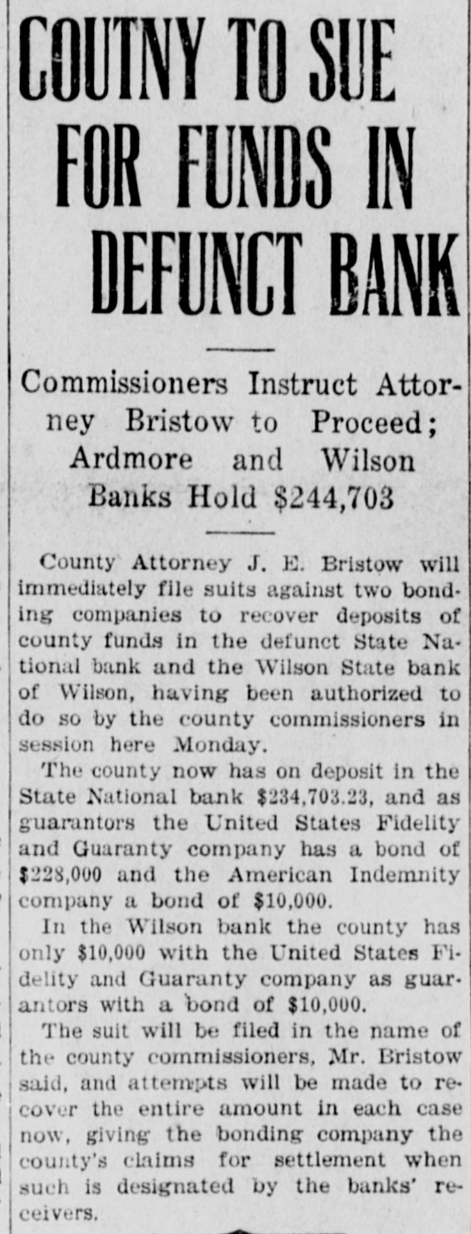 Helps in Methodist Foundation Strice the organization or the has been dean of this Institution or the Oklahoma Methodist Foundation in connection with the state at Norman and member the of beard of trustees of same new field of duties for the first time in his ministerial career of which years It is with regret that Ardmore goodby splendid people Dr Morgan and his people of this community during the they have called this home among the most responsible and wealthy men of Carter county George Legate, of the hamber of commerce, has interviewed he men of Wilson thoroughly nd finds nothing but confidence ex pressed, he 'Wilson business men feel confident hat those behind the Institution, whose integrity cannot be impeach will re open the bank as soon as affairs can be straightened out by the state banking