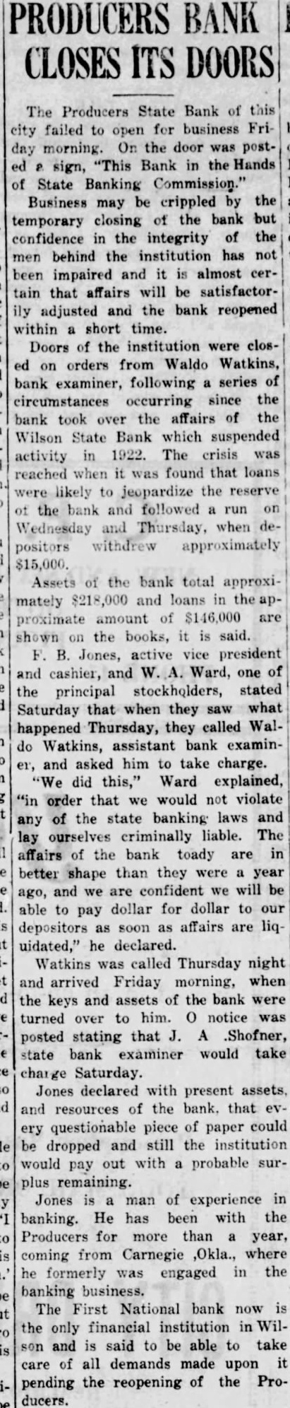 Jones is man of experience in banking He has been with the Producers for more than year. coming from Carnegie, Okla. where he formerly was engaged in the banking business. Some have expressed curiosity at the resignation of O. K. (Buster) Coulter, who quit his post three weeks ago and whose place had not been filled. The matter explained by Legate, who said that Coulter resigned last Janu ary He is an expert accountant and desired to enter business for himself. On account of family connections he was induced to remain with the bank until three weeks ago when he quit. Three Failures at Wilson The Wilson has suffered three bank failures since 1922. when the Wilson State bank went under and was reorganized later as the Producers State bank The City State bank closed Its doors in 1924, and to complete the list the Producers was taken over by the state banking board Friday Some business men of Wilson had all their cash in the closed bank and are in an embarrassing position, 08 many have mailed checks to dealers that essarily will be returned unpaid They are making arrangements, however, to take care of their credit The First National bank now is only financial institution in Wilson and is said to be able to take care of all demands made upon it pending the reopening of the Producers.