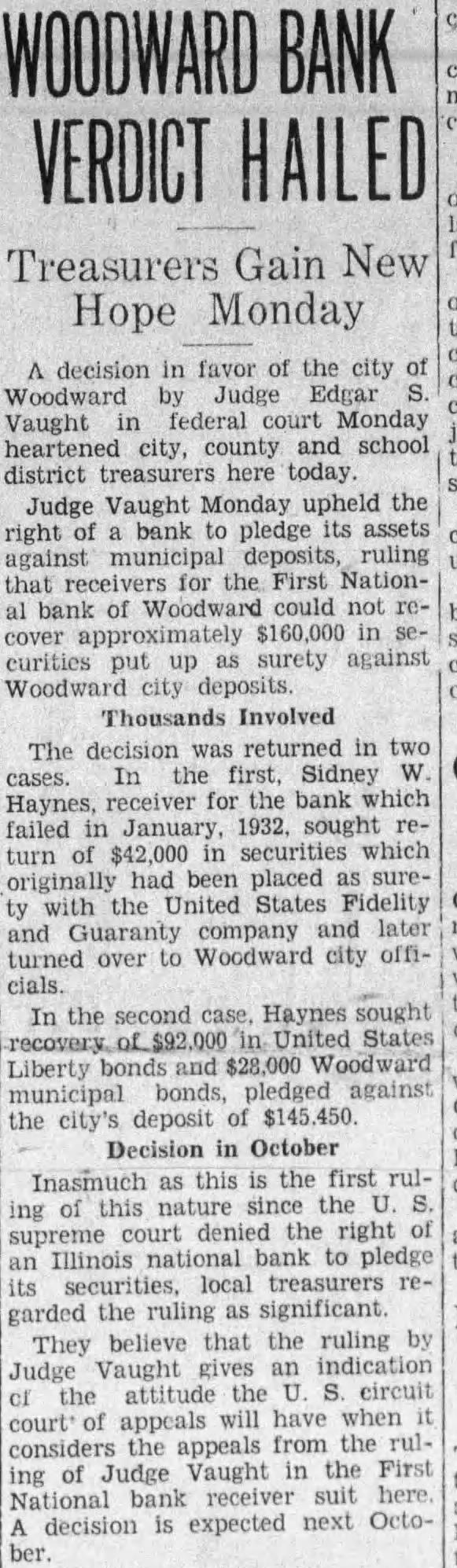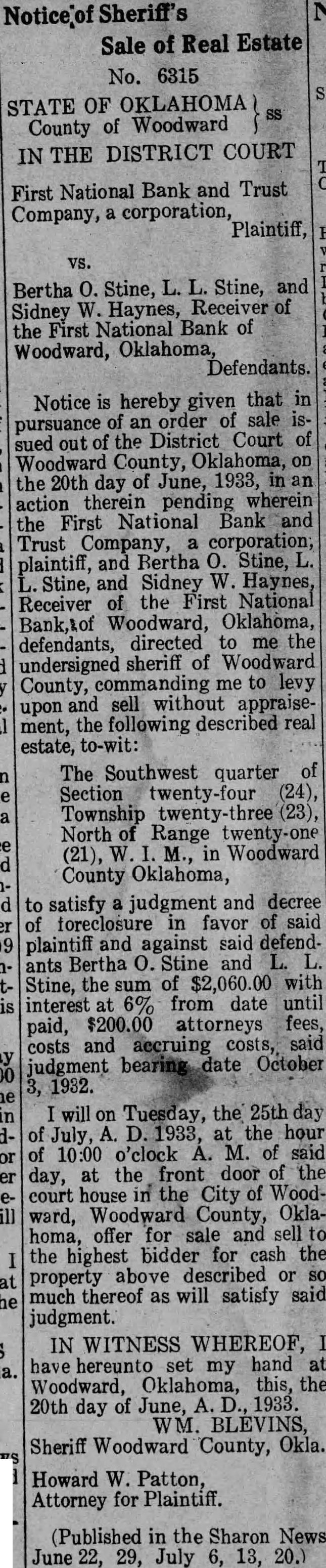 Notice is hereby given that in pursuance of an order of sale issued out of the District Court of Woodward County, Oklahoma, on the 20th day of June, 1933, in an action therein pending wherein the First National Bank and Trust Company, a corporation; plaintiff, and Bertha O. Stine, L. Stine, and Sidney W. Haynes, Receiver of the First National Bank, Woodward, Oklahoma, defendants, directed to me the undersigned sheriff of Woodward County, commanding me to levy upon and sell without appraisement, the following described real estate, to-wit: