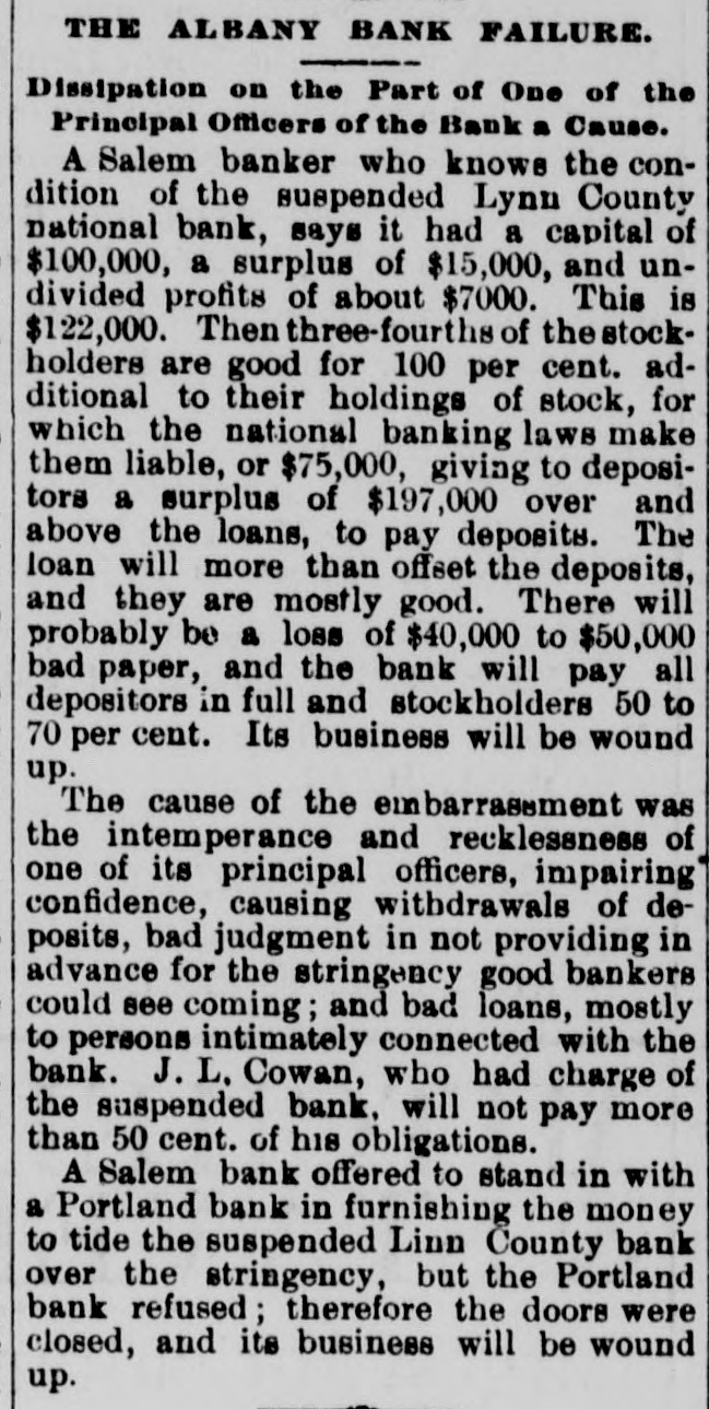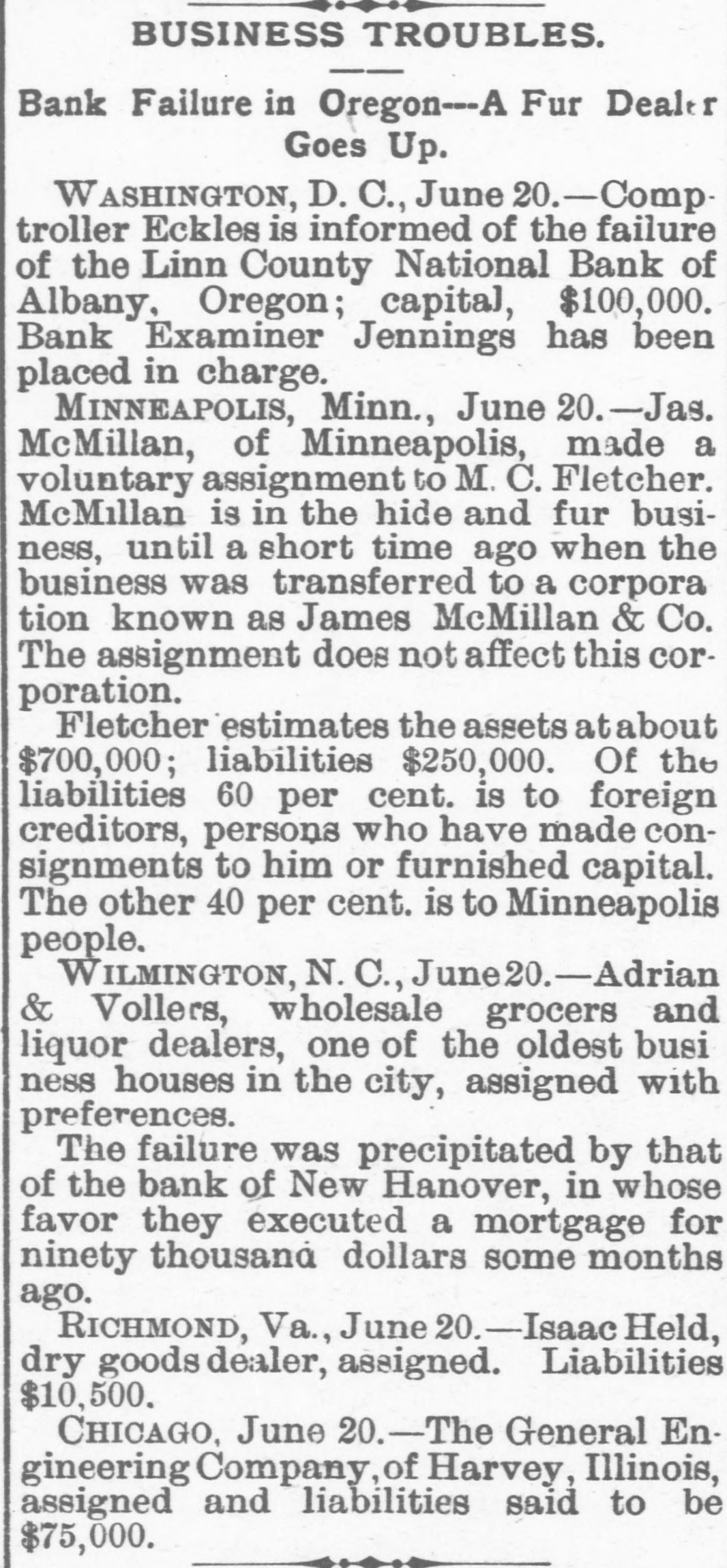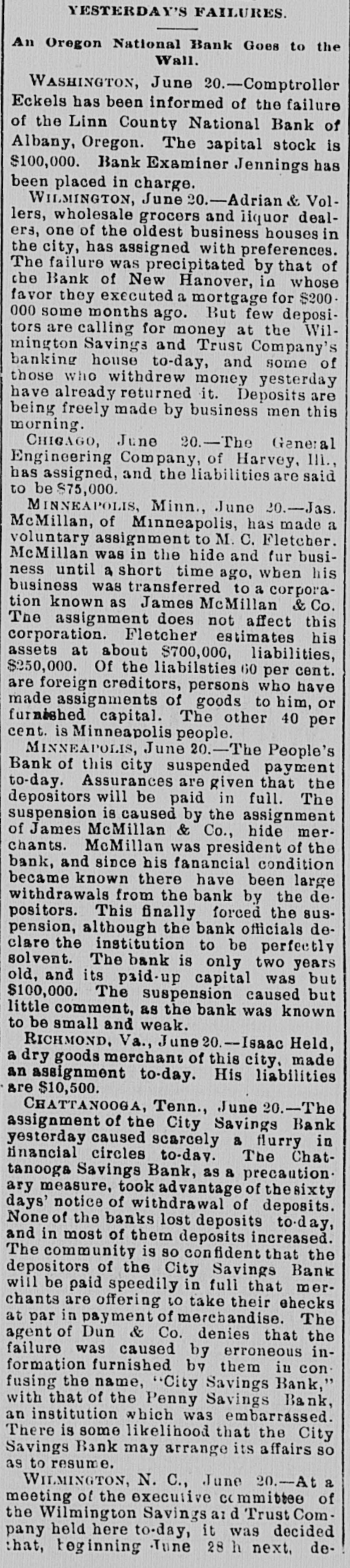 OTHER FAILURES RESULT From the Wilmington Bank Failure. Other Financial Troubles. WILMINGTON N. C., June 20.-Adrian & Vollers, wholesale grocers and liquor dealers, one of the oldest business houses in the city, asigned with preferences." The failure was precipitated by that of the Bank of New Hanover, in whose favor they executed a mortgage for ninety thousand dollars some months ago. But few depositors are calling for money at the Wilmington Savings and Trust Company's banking house to-day, and some of those who withdrew their money yesterday have already returned it. Deposits were being freely made by business men this morning. At a meeting of the executive committee of the Wilmington Savings and Trust deCompany, held here to-day, it was cided that, beginning with June 28th next, dedepositors desiring to withdraw their full. posits from the bank will be paid in H. Walters, vice-president of the company, received the following telegram to-day: "Baltimore, June 19.-Draw on us at sight for $100,000. or any part thereof, if required for your Savings and Trust Company. (Signed) "W. T. WALTERS, "B. F. NEWCOMER." The Chattanooga Failure CHATTANOOGA June 20.-The assignment of the City Savings Bank yesterday caused scarcely a flurry in financial circles to-day. The Chattanooga Savings Bank, as a precautionary measure, took advantage of the sixty days' notice of withdrawal of deposits. None of the banks lost deposits to-day, and in most of them the deposits increased. The community is so confident that the depositors of the City Savings Bank will be paid speedily in full that merchants are offering to take their checks at par in payment for merchandise. The agent of Dun & Co. denies that the failure was caused by erroneous information furnished by them in confusing the name "City Savings Bank" with the "Penny Savings" institution, which was embarrassed. There is some likelihood that the City Savings Bank may arrange its affairs so as to resume. Minneapolis Bank Failure. MINNEAPOLIS, MINN., June 20.-The Peoples' Bank, of this city, suspended payment to-day. Assurances are given that depositors will be paid in full. The suspension is caused by the assignment of James McMillan, the hide merchants Mr. McMillan was the president of the bank, and since his financial condition became known there have been large withdrawals from the bank by depositors. This finally forced suspension, although the bank officials declare the institution to be perfectly solvent. The bank is only two years old, and its paidup capital was but $100,000. The suspension caused but little comment, as the bank was known to be small and weak. Other Failures Reported MINNEAPOLIS, MINN., June 20.-Jas. McMillan, of this city, made a voluntary assignment to M. C. Fletcher. McMillan was in the hide and fur business until short time ago, when the business was transferred to a corporation known as James McMillan & Co. The assignment does not affect this corporation. Fletcher estimates the assets at about $700,000. Liabilities, $250,000. Of the liabilities 60 per cent. are foreign creditors, who have made consignments of him or furnished other 40 per cent. are goods persons to Minneapolis capital. people. The CHICAGO, June 20.-The Central Engineering Company, of Harvey, III., has assigned. The liabilities are said to be $75,000. WASHINGTON, D. C., June 20.-Comproller Eckels has been informed of the failure of the Linn County National Bank, of Albany, Oregon. Its capital was $100,00. Bank Examiner Jennings has been placed in charge.