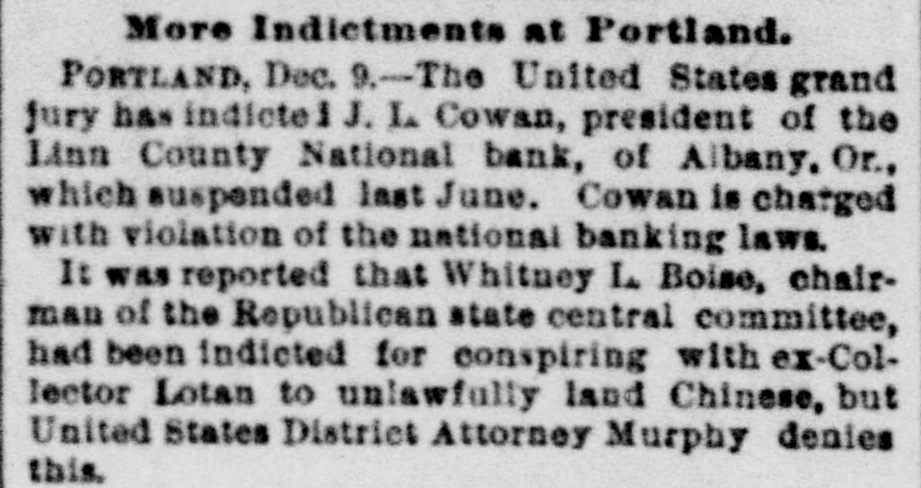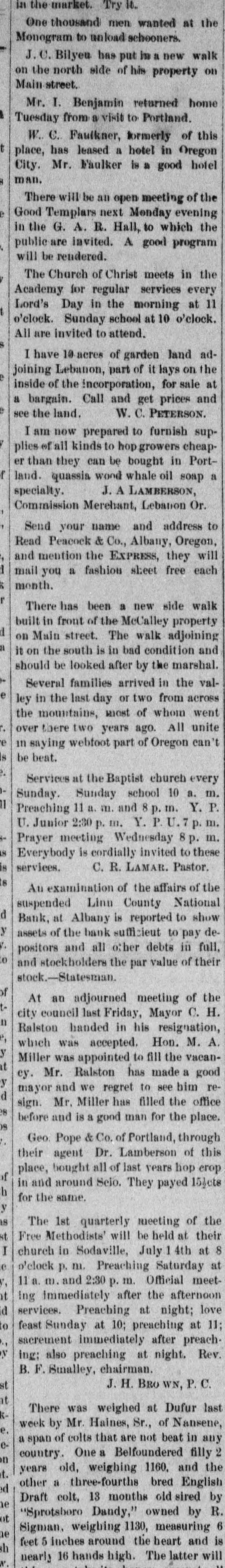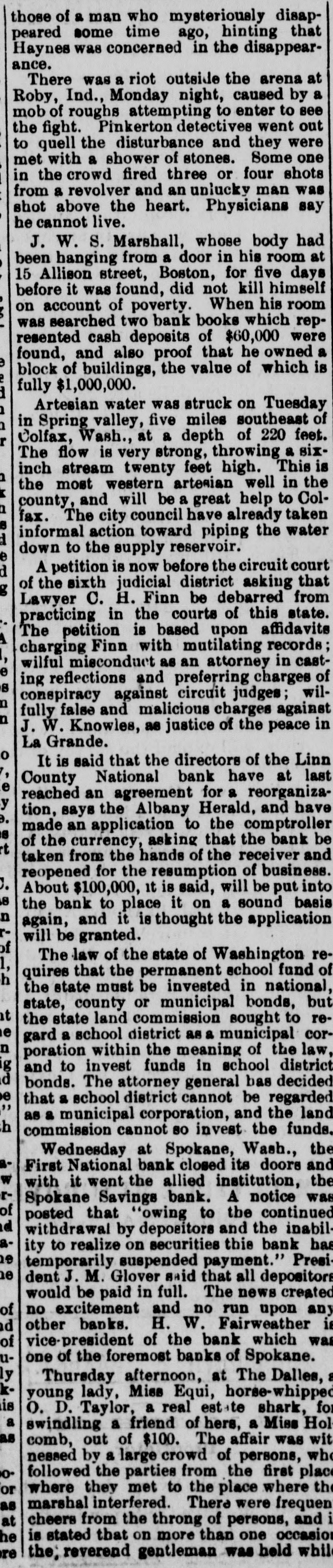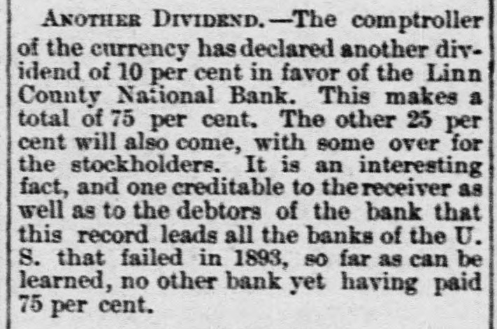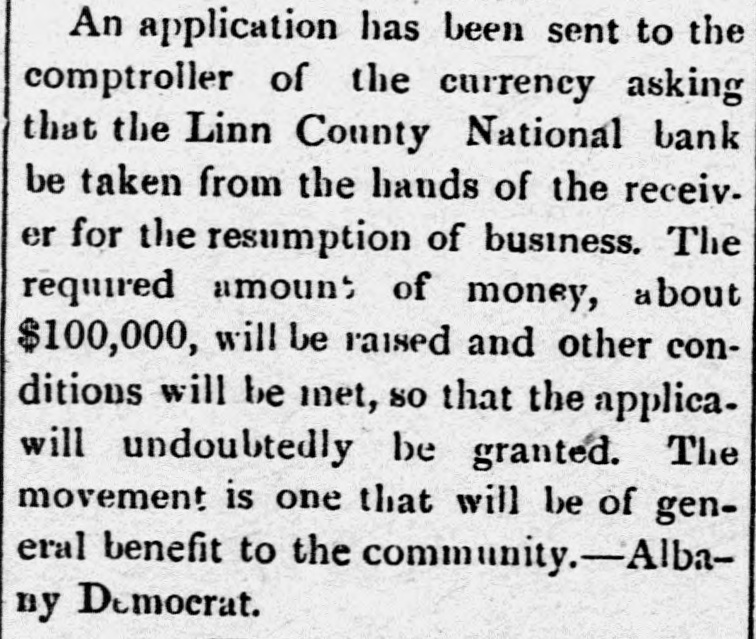 OTHER FAILURES RESULT From the Wilmington Bank Failure. Other Financial Troubles. WILMINGTON N. C., June 20.-Adrian & Vollers, wholesale grocers and liquor dealers, one of the oldest business houses in the city, asigned with preferences." The failure was precipitated by that of the Bank of New Hanover, in whose favor they executed a mortgage for ninety thousand dollars some months ago. But few depositors are calling for money at the Wilmington Savings and Trust Company's banking house to-day, and some of those who withdrew their money yesterday have already returned it. Deposits were being freely made by business men this morning. At a meeting of the executive committee of the Wilmington Savings and Trust deCompany, held here to-day, it was cided that, beginning with June 28th next, dedepositors desiring to withdraw their full. posits from the bank will be paid in H. Walters, vice-president of the company, received the following telegram to-day: "Baltimore, June 19.-Draw on us at sight for $100,000. or any part thereof, if required for your Savings and Trust Company. (Signed) "W. T. WALTERS, "B. F. NEWCOMER." The Chattanooga Failure CHATTANOOGA June 20.-The assignment of the City Savings Bank yesterday caused scarcely a flurry in financial circles to-day. The Chattanooga Savings Bank, as a precautionary measure, took advantage of the sixty days' notice of withdrawal of deposits. None of the banks lost deposits to-day, and in most of them the deposits increased. The community is so confident that the depositors of the City Savings Bank will be paid speedily in full that merchants are offering to take their checks at par in payment for merchandise. The agent of Dun & Co. denies that the failure was caused by erroneous information furnished by them in confusing the name "City Savings Bank" with the "Penny Savings" institution, which was embarrassed. There is some likelihood that the City Savings Bank may arrange its affairs so as to resume. Minneapolis Bank Failure. MINNEAPOLIS, MINN., June 20.-The Peoples' Bank, of this city, suspended payment to-day. Assurances are given that depositors will be paid in full. The suspension is caused by the assignment of James McMillan, the hide merchants Mr. McMillan was the president of the bank, and since his financial condition became known there have been large withdrawals from the bank by depositors. This finally forced suspension, although the bank officials declare the institution to be perfectly solvent. The bank is only two years old, and its paidup capital was but $100,000. The suspension caused but little comment, as the bank was known to be small and weak. Other Failures Reported MINNEAPOLIS, MINN., June 20.-Jas. McMillan, of this city, made a voluntary assignment to M. C. Fletcher. McMillan was in the hide and fur business until short time ago, when the business was transferred to a corporation known as James McMillan & Co. The assignment does not affect this corporation. Fletcher estimates the assets at about $700,000. Liabilities, $250,000. Of the liabilities 60 per cent. are foreign creditors, who have made consignments of him or furnished other 40 per cent. are goods persons to Minneapolis capital. people. The CHICAGO, June 20.-The Central Engineering Company, of Harvey, III., has assigned. The liabilities are said to be $75,000. WASHINGTON, D. C., June 20.-Comproller Eckels has been informed of the failure of the Linn County National Bank, of Albany, Oregon. Its capital was $100,00. Bank Examiner Jennings has been placed in charge.