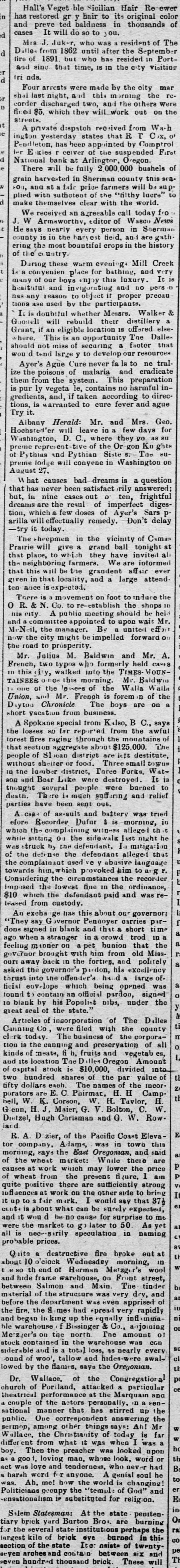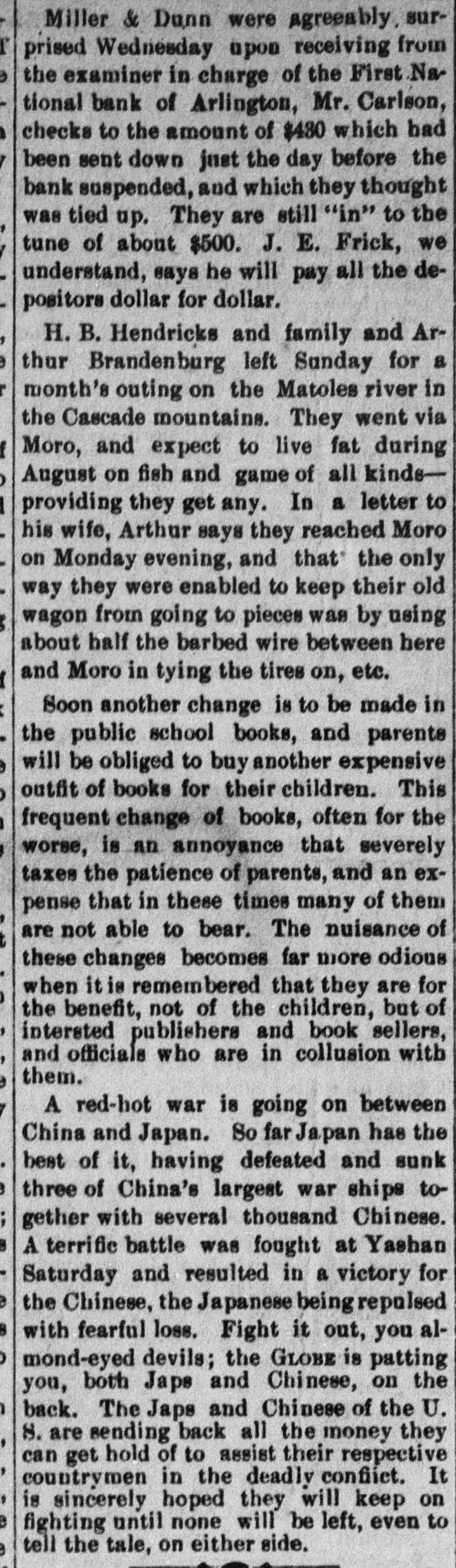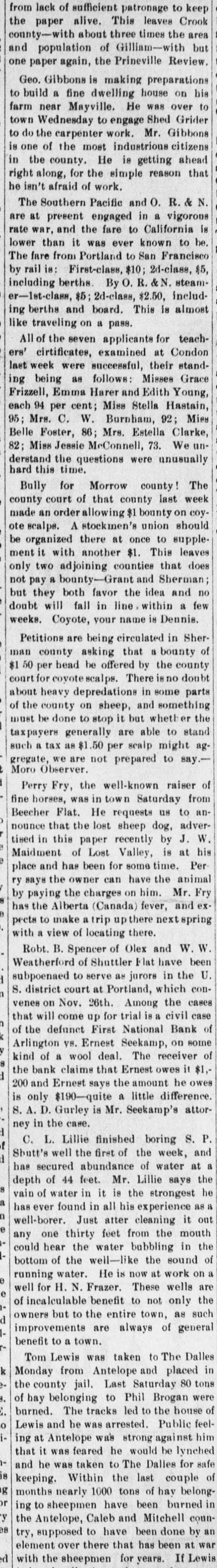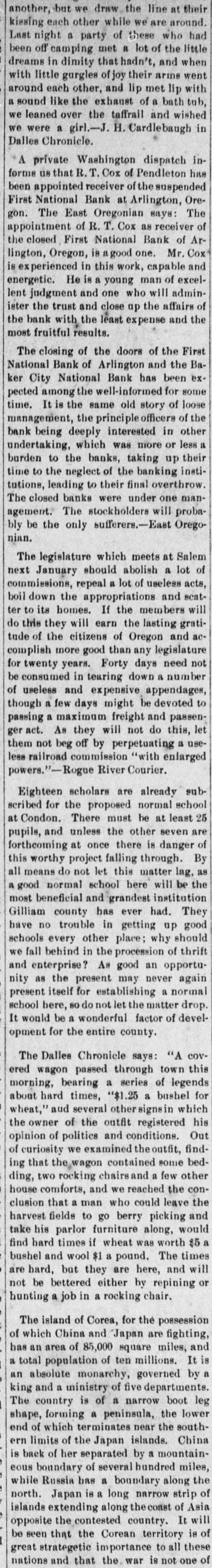 jeweler and we bespeak for him a healthy business. He has engaged Mr Robinson to assist him several weeks. All our people interested in a good school will be glad to learn that the prospects are good for opening a norma school at Condon this fall with Prof. o M. Given of Indiana as instructor. He has concluded to come providing satis factory arrangements can be made by our people. Those wishing to send pupils or learn particulars should apply at once to L. W. Darling, who has the subscription paper. This matter is too important to neglect. C. H. Crawford, the gambler who had Myron Hamilton arrested and bound over to the grand jury on suspicion of having stolen $140 from him while asleep in the Jordan hotel at Arlington, found his money a few days ago in the bed where he had put it himself. The proper thing to do in this case is to tax the costs of prosecution up to the proseentor, besides fine him the $140 for his carelessness. It would have a tendency to discourage such cases. While Misses Birdie and Dora Downing were returning home Friday evening from Beecher Flat, a short distance east of town the cart struck a rock in the road, tilting it in such a manner as to throw Miss Birdie out and'in front of the cart, which ran over her. She was pretty badly hurt, and has been under the doctor's care since. The doctor thinks she will beable to begin teaching again in about a month, having been engaged to teach the fall term of the Mayville school. Married, at Condon on Monday, July 23, 1894, Mr. Albert Collins and Miss Julia Conture, both of Ferry Canyon The ceremony was performed in the Catholic church of this place by Father Busha of Pendleton, and was witnessed by a large number of friends. Misses Susan Dunn and Carrie Danneman acted as bridesmaids and Messrs. R. H. Rob inson and John Couture as groomsmer for the happy event. In the evening pleasant ball was given in the hall in their honor. The GLOBE extends the usual congratulations. The news of the suspension of the First National bank of Arlington or Tuesday morning, 24th, caused quite I ripple of excitement among our people when they first learned of it next day A dozen or more of our business men are "nipped" to the tune of several hundred dollars or more, and a number of them for small amounts. One of the most dif ficult things for the public to understand is why the bank's last quarterly state ment represented it to be in a flourish ing condition. The Arlington Record even commented upon the bank's sound financial condition. F. C. Rollo, the cashier, we are informed, says the de positors will not lose anything, as there is enough money on hand to pay then all in full. As per order of our county court Messrs. R. G. Robinson of Lone Rock C. A. Danneman of Clem, and Jas Frizzell of Lost Valley met Monday and assessed the damage for the new road up the ravine from Thirtymile to Con don. Looney asked for $1000 damage and was allowed $160; Trimble asked $150 damage and was allowed nothing F. M. Shannon asked for $100 damage and was allowed $30; Jas. Kiser asked for $100 damage and was allowed $25. / fairer or more impartial board of asses sors could not have been appointed, and it is hoped their decision will be satis factory to all concerned. It is hope that work will be commenced on thi new road at once, so as to have it read for the fall bauling of wheat, etc. Thi improvement will be worth more to the people of this county than any othe that could be done with three times th expense of this road. Back Creek Notes