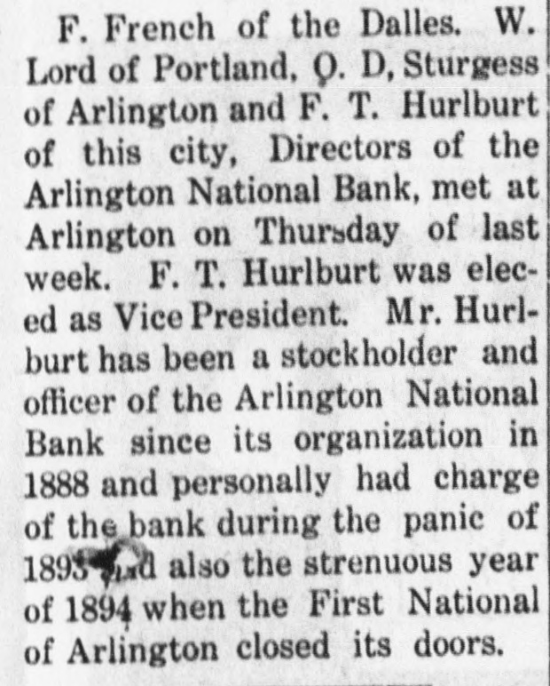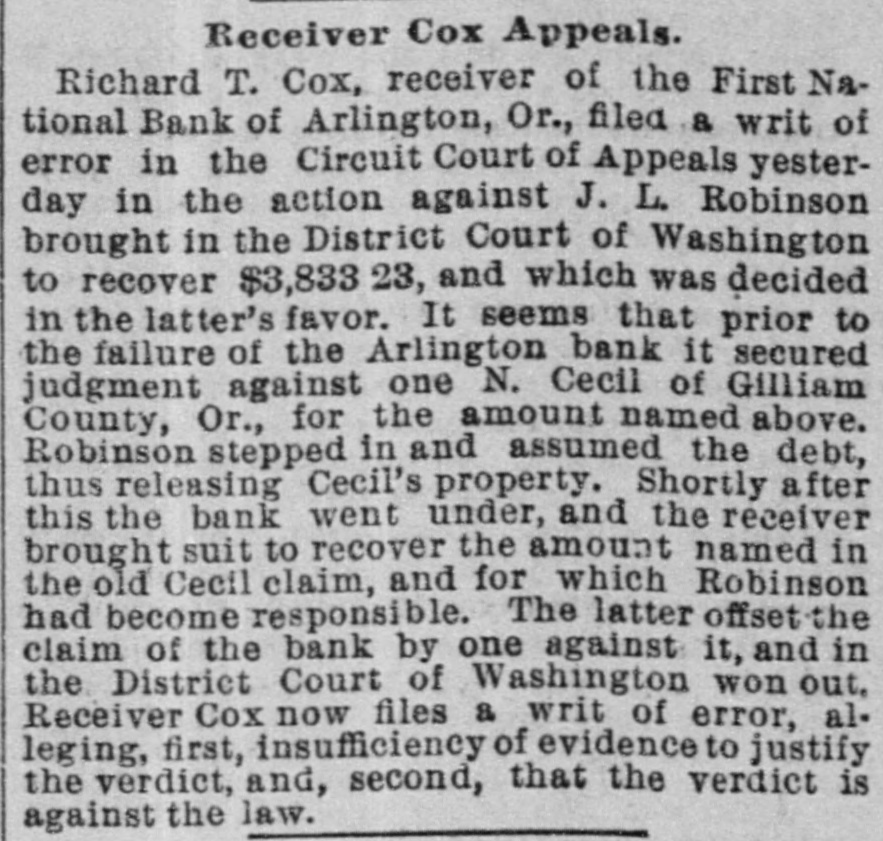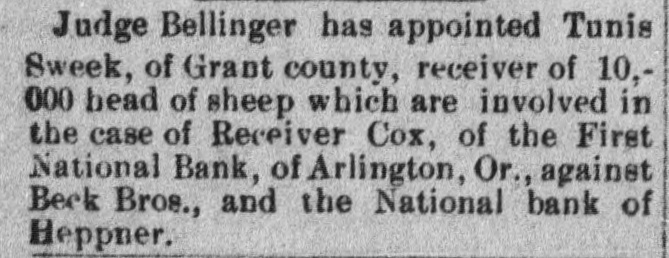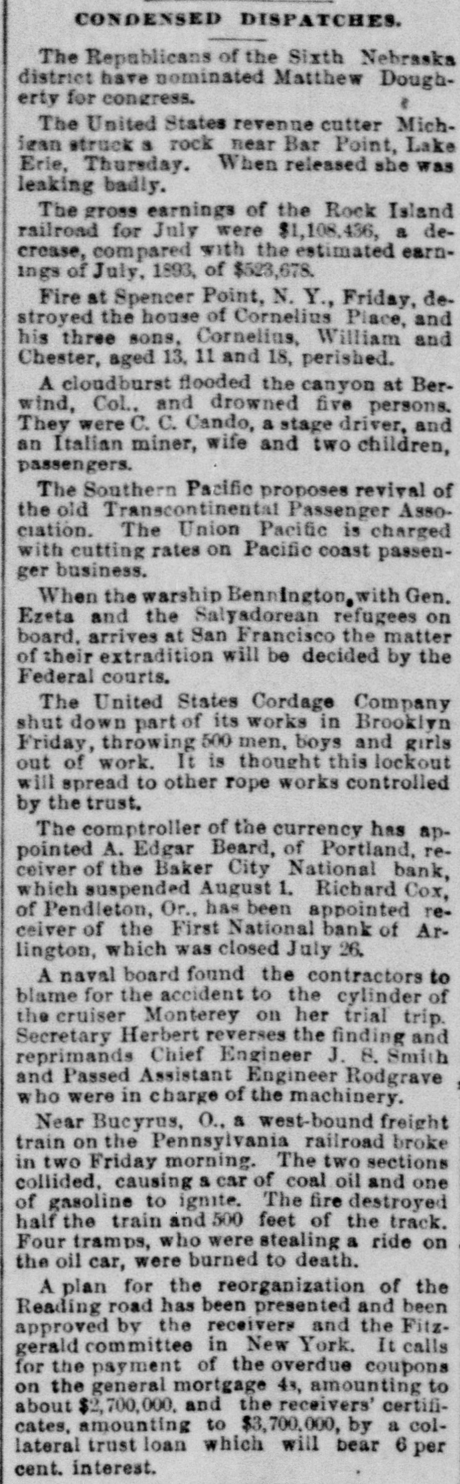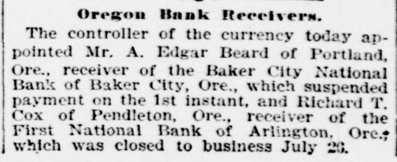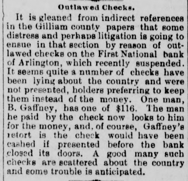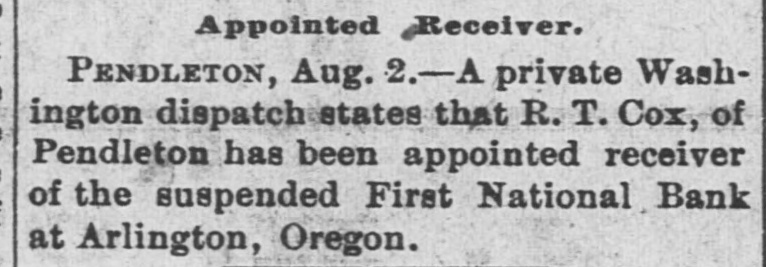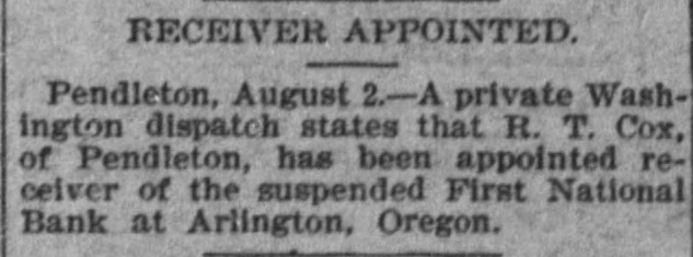 jeweler and we bespeak for him a healthy business. He has engaged Mr Robinson to assist him several weeks. All our people interested in a good school will be glad to learn that the prospects are good for opening a norma school at Condon this fall with Prof. o M. Given of Indiana as instructor. He has concluded to come providing satis factory arrangements can be made by our people. Those wishing to send pupils or learn particulars should apply at once to L. W. Darling, who has the subscription paper. This matter is too important to neglect. C. H. Crawford, the gambler who had Myron Hamilton arrested and bound over to the grand jury on suspicion of having stolen $140 from him while asleep in the Jordan hotel at Arlington, found his money a few days ago in the bed where he had put it himself. The proper thing to do in this case is to tax the costs of prosecution up to the proseentor, besides fine him the $140 for his carelessness. It would have a tendency to discourage such cases. While Misses Birdie and Dora Downing were returning home Friday evening from Beecher Flat, a short distance east of town the cart struck a rock in the road, tilting it in such a manner as to throw Miss Birdie out and'in front of the cart, which ran over her. She was pretty badly hurt, and has been under the doctor's care since. The doctor thinks she will beable to begin teaching again in about a month, having been engaged to teach the fall term of the Mayville school. Married, at Condon on Monday, July 23, 1894, Mr. Albert Collins and Miss Julia Conture, both of Ferry Canyon The ceremony was performed in the Catholic church of this place by Father Busha of Pendleton, and was witnessed by a large number of friends. Misses Susan Dunn and Carrie Danneman acted as bridesmaids and Messrs. R. H. Rob inson and John Couture as groomsmer for the happy event. In the evening pleasant ball was given in the hall in their honor. The GLOBE extends the usual congratulations. The news of the suspension of the First National bank of Arlington or Tuesday morning, 24th, caused quite I ripple of excitement among our people when they first learned of it next day A dozen or more of our business men are "nipped" to the tune of several hundred dollars or more, and a number of them for small amounts. One of the most dif ficult things for the public to understand is why the bank's last quarterly state ment represented it to be in a flourish ing condition. The Arlington Record even commented upon the bank's sound financial condition. F. C. Rollo, the cashier, we are informed, says the de positors will not lose anything, as there is enough money on hand to pay then all in full. As per order of our county court Messrs. R. G. Robinson of Lone Rock C. A. Danneman of Clem, and Jas Frizzell of Lost Valley met Monday and assessed the damage for the new road up the ravine from Thirtymile to Con don. Looney asked for $1000 damage and was allowed $160; Trimble asked $150 damage and was allowed nothing F. M. Shannon asked for $100 damage and was allowed $30; Jas. Kiser asked for $100 damage and was allowed $25. / fairer or more impartial board of asses sors could not have been appointed, and it is hoped their decision will be satis factory to all concerned. It is hope that work will be commenced on thi new road at once, so as to have it read for the fall bauling of wheat, etc. Thi improvement will be worth more to the people of this county than any othe that could be done with three times th expense of this road. Back Creek Notes
