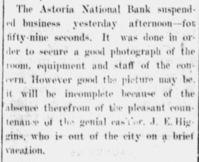 The Astoria National Bank suspended business yesterday afternoon-for fifty-nine seconds. It was done in order to secure a good photograph of the room. equipment and staff of the concern. However good the picture may be. it will be incomplete because of the absence therefrom of the pleasant countenance of the genial eashier. J. E. Higgins, who is out of the city on @ brief vacation.
