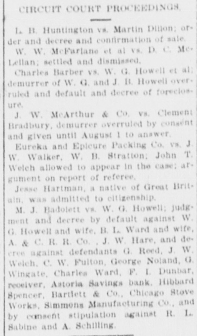 CIRCUIT COURT PROCEEDINGS L. H. Huntington VII. Martin Dillon: order and decree and confirmation of sale W. W. McFarlane et at VN. D. C. Mc. Lellan: settled and dismissed Charles Barber vs. W. G. Howell et all demurrer of W. G. and J. B. Howell over. ruled and default and decree of foreciosure. J. W. McArthur & Co. V3. Clement Bradbury demurrer overruled by consént and given until August 1 to answer Eureka and Epicure Packing Co. vs. J. W. Walker, W. B. Stratton John T. Welch allowed to appear in the case: argument on report of referee Jesse Hartman a native of Great Britain. was admitted to citizenship. M. J. Badolett VR. W. G. Howell; judgment and decree by default against W. G Howell and wife. B. L. Ward and wife, A. & C. R. R Co. J. W. Hare, and decree against defendants G. Reed, J. W. Welch C. W. Fulton George Noland, G. Wingate Charles Ward, F. I. Dunbar, receiver Astoria Savings bank Hibbard Spencer. Bardlett & Co., Chicago Stove Works. Simmons Manufacturing Co., and by consent stipulation against R. 1. Sabine and A. Schilling