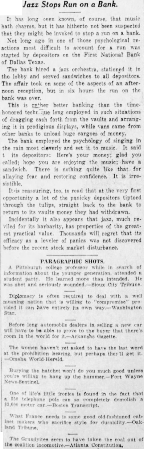 Jazz Stops Run on Bank. It has long known, of course, that music hath charms, but has hitherto not been suspected that they might be invoked to stop run on bank. Not long in of those psychological reactions most difficult to account for run was started by depositors on the First National Bank Dallas Texas. The bank hired jazz orchestra. stationed it the lobby and served sandwiches to all depositors. The affair took on some of the aspects of an afterreception, but in six hours the run on the was over. This rether better banking than the time. honored techn long employed in such situations of dragging cash forth from the vaults and arranging in prodigious displays, while vans came from other banks unload huge cargoes of money. The bank employed the psychology of singing in the rain most cleverly and set it music. said its depositors: Here's your money; glad you called; hope are enjoying the music; have sandwich. There nothing quite like that for allaying fear and restoring confidence. It is irreIt-is reassuring, to read that at the very first lot of the panicky depositors tiptoed through the tulips, straight back to the bank return its vaults money they had withdrawn. Incidentally also appears that jazz, much reviled for its barbarity, has properties of the greatest practical value. Thousands will regret that its efficacy leveler panies not discovered before the recent stock market disturbance. PARAGRAPHIC SHOTS. Pittsburgh in search about attended student party He more than He shot and City Tribune. Diplomacy often required deal with nation provided can have entirely its own Star. Before long automobile dealers in selling new will prove the buyer that there's room the world for Gazette. The women haven't yet asked to have the last word the bearing, but perhaps get -Omaha World Herald. Burying the hatchet you much good unless to hang up the of life's little Ironies is found the fact that pole motor Transcript. France needs good fashioned sacrifice style for land Tribune. The Grundyites taken the out of coalition