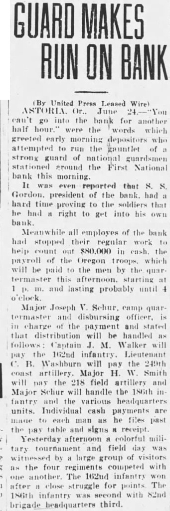 MAKES ON BANK (By United Press Leased Wire) ASTORIA. June can't go into the bank for another half hour the words which greeted early morning depositors who attempted run the gauntlet of strong guard of national guardsmen ground the First National bank this morning. even reported that Gordon. president of the bank. had hard time proving to the soldiers that he right to get into his own bank. Meanwhile all employes of the bank had stopped their regular work help $80,000 in cash. the payroll of the Oregon troops. which will be paid the men by the quar termaster this afternoon. starting at and lasting probably until Major Joseph V. Schur. camp quartermaster and disbursing officer, charge the payment and stated that distribution will be handled follows Captain M. Walker will pay the 162nd infantry. Lieutenant B. will pay the 249th coast artillery. Major H. W. Smith will pay the 218 field artillery and Major Schur will handle the 186th in fantry and the various headquarters units. Individual cash payments are to each man he files past the pay table signs receipt Yesterday afternoon colorful military tournament field day was witnessed by large group of visitors as the four regiments competed with one another. The 162nd infantry after close struggle for points The 186th infantry second with 82nd brigade headquarters third.