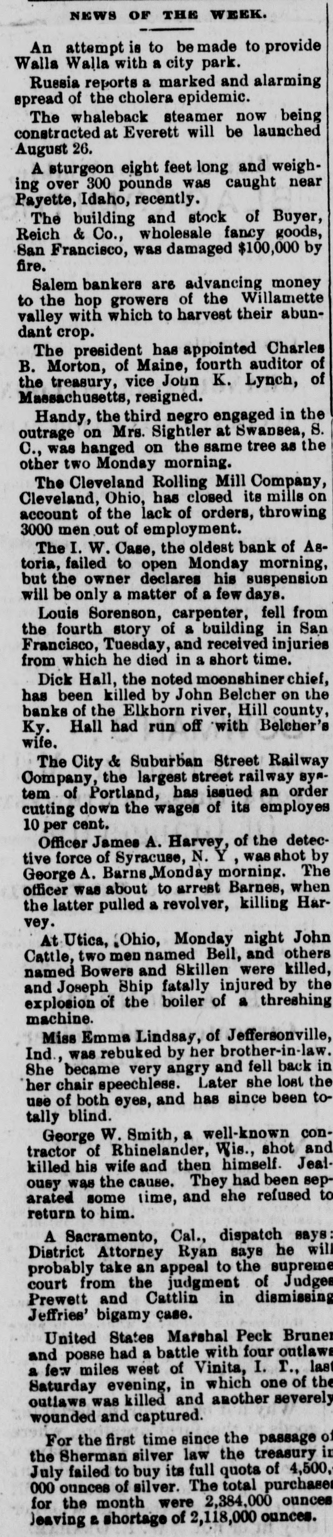 NEWS OF THE WEEK. An attempt is to be made to provide Walla Walla with a city park. Russia reports a marked and alarming spread of the cholera epidemic. The whaleback steamer now being constructed at Everett will be launched August 26. A sturgeon eight feet long and weighing over 300 pounds was caught near Payette, Idaho, recently. The building and stock of Buyer, Reich & Co., wholesale fancy goods, San Francisco, was damaged $100,000 by fire. Salem bankers are advancing money to the hop growers of the Willamette valley with which to harvest their abundant crop. The president has appointed Charles B. Morton, of Maine, fourth auditor of the treasury, vice John K. Lynch, of Massachusetts, resigned. Handy, the third negro engaged in the outrage on Mrs. Sightler at Swansea, S. C., was hanged on the same tree as the other two Monday morning. The Cleveland Rolling Mill Company, Cleveland, Ohio, has closed its mills on account of the lack of orders, throwing 3000 men out of employment. The I. W. Case, the oldest bank of Astoria, failed to open Monday morning, but the owner declares his suspension will be only a matter of a few days. Louis Sorenson, carpenter, fell from the fourth story of a building in San Francisco, Tuesday, and received injuries from which he died in a short time. Dick Hall, the noted moonshiner chief, has been killed by John Belcher on the banks of the Elkhorn river, Hill county, Ky. Hall had run off with Belcher's wife. The City & Suburban Street Railway Company, the largest street railway system of Portland, has issued an order cutting down the wages of its employes 10 per cent. Officer James A. Harvey, of the detective force of Syracuse, N. Y, wasshot by George A. Barns ,Monday morning. The officer was about to arrest Barnes, when the latter pulled a revolver, killing Harvey. At Utica, Ohio, Monday night John Cattle, two men named Bell, and others named Bowers and Skillen were killed, and Joseph Ship fatally injured by the explosion of the boiler of a threshing machine. Miss Emma Lindsay, of Jeffersonville, Ind., was rebuked by her brother-in-law. She became very angry and fell back in her chair speechless. Later she lost the use of both eyes, and has since been totally blind. George W. Smith, a well-known contractor of Rhinelander, Wis., shot and killed his wife and then himself. Jealousy was the cause. They had been separated some time, and she refused to return to him. A Sacramento, Cal., dispatch says: District Attorney Ryan says he will probably take an appeal to the supreme court from the judgment of Judges Prewett and Cattlin in dismissing Jeffries' bigamy case. United States Marshal Peck Bruner and posse had a battle with four outlaws a few miles west of Vinita, I. Γ., last Saturday evening, in which one of the outlaws was killed and another severely wounded and captured. For the first time since the passage of the Sherman silver law the treasury in July failed to buy its full quota of 4,500, 000 ounces of silver. The total purchases for the month were 2,384,000 ounces Jeaving a shortage of 2,118,000 ounces.