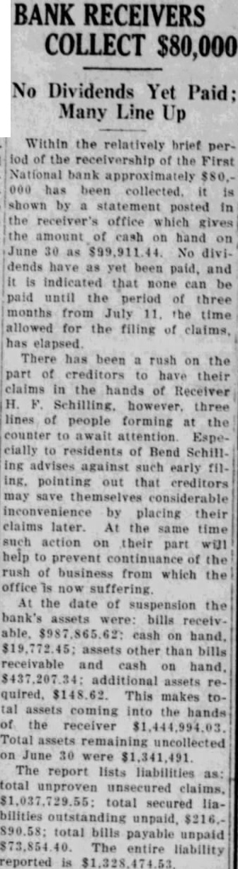 Within the relatively brief period of the receivership of the First National bank approximately $80.000 has been collected. shown by a statement posted in the receiver's office which gives the amount of cash on hand June 30 No dends have as been paid, and is indicated that none can be paid until period of three months from July the time allowed for the filing of claims. has elapsed. There has been rush on the part of creditors to have their claims in the hands of Receiver however, three lines of people forming at the counter to await attention. Especially to residents of Bend Schilling advises against such early ing. pointing out that creditors may save themselves considerable inconvenience by placing their claims later. At the same time such action on their part help to prevent continuance of the rush of business from which the now the date of suspension the bank's assets were: bills receivable. cash on assets other than bills receivable and cash on hand. additional assets quired. This makes assets coming into the hands of the receiver Total assets remaining uncollected on June 30 were The report lists liabilities total unproven unsecured claims, total secured liabilities outstanding unpaid, $216.total bills payable unpaid The entire liability reported