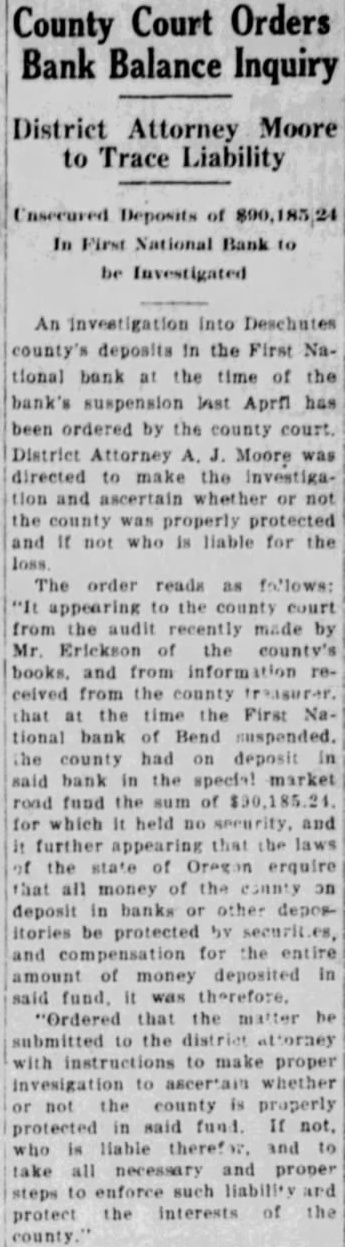 District Attorney Moore to Trace Liability For $90,185.24 In First National Bank Of Bend.