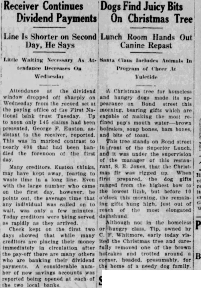Christmas for homeless and hungry dogs made its pearance Bond street this morning. bearing gifts which capable of making most fined pup's mouth soup bones, ham bones, bits of tree stands on Bond street of the Superior and under the supervision manager this restauthat the Christfir rigged When first the dog gifts ranged from the highest bow the lowest limb, but before this the remainhung high, just out of reach of the most elongated Although not in the homeless Tip. owned by early today visIted the Christmas tree and removed one the brown hotcakes and trotted around headed. for home of needy dog family.
