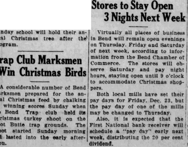 Virtually all places of business Bend will remain open evenings Thursday. Friday and Saturday next week, according to information from the Bend Chamber Commerce. The stores will Saturday and pay night hours, staying open until o'clock accommodate Christmas pers.