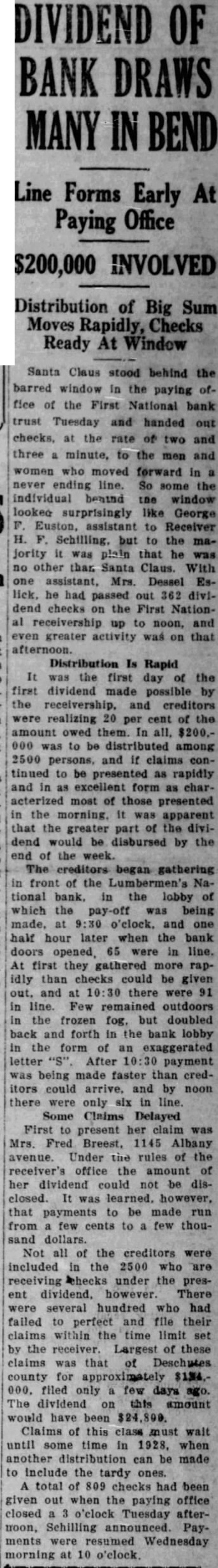 Santa Claus stood behind the barred window In the paying fice of the First National bank trust Tuesday and handed out checks, the rate of two and three minute, to and women who moved forward in ending line. So the individual the window surprisingly like George assistant Receiver Schilling, but the jority it was plain that he other than Santa Claus. With assistant, Mrs. Dessel Eslick. he had passed out 362 dend checks the First Nationreceivership up to noon, greater activity was that afternoon. Distribution Is Rapid was the first day the first dividend made possible by the and creditors realizing per cent of the amount owed them. all, $200.to be distributed among 2500 persons, and claims tinued to be presented as rapidly and in excellent form characterized most of those presented the morning, apparent that the greater part of the dividend would be disbursed by the end of week. gathering front of the Lumbermen's National bank. in the of which the pay-off was being made, o'clock, and one half hour later when the bank doors 65 were line. At first they gathered rapidly than checks could be given and there were line. Few remained outdoors the frozen but doubled back and forth in the bank lobby the form an exaggerated letter After payment being made faster than creditors could arrive. and by noon there were only six in line. Some Claims Delayed First to present her claim was Mrs. Fred Albany avenue. Under the rules the receiver's office the amount of her dividend could be disclosed. learned. however, that payments to be made run from few cents to few thousand dollars. Not all of the creditors were included the 2500 who checks under the present dividend, however. There were several hundred who had failed to perfect and file their claims within the time limit set the receiver. Largest of these claims was that county for filed only few days The dividend on this amount would have been Claims of this class must wait until some time in 1928, when another distribution can be made include the tardy total of 809 checks had been given out when the paying office closed o'clock Tuesday aftermoon, Schilling announced. Payments were resumed Wednesday morning at 10