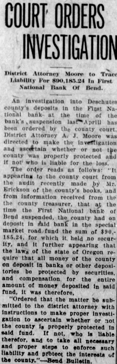An investigation into Deschutes county's deposits in the First National bank- at the time of the bank's suspension st Aprill has been ordered by the county court. District Attorney A. J. Moore was directed to make the investigation and ascertain whether or not the county was properly protected and If not who is liable for the loss. The order reads as follows: "It appearing to the county court from the audit recently made by Mr. Erickson of the county's books, and from information received from the the county treasurer, that at the time the First National bank of Bend suspended, the county had on deposit in said bank in the special market road fund the sum of $90.185.24, for which it. held no security. and it further appearing that the laws of the state of Oregon require that all money of the county on deposit in banks or other depositories be protected by securities, and compensation for the entire amount of money deposited in said fund, it was therefore, "Ordered that the matter be submitted to the district attorney with instructions to make proper investigation to ascertain whether or not the county is properly protected in said fund. If not, who is liable therefor, and to take all necessary and proper steps to enforce such liability and protect the interests of the Bulletin.