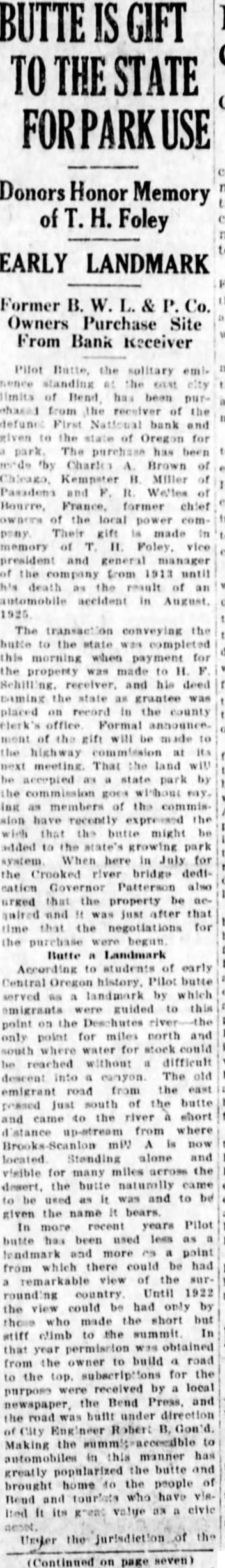 Pilot the solitary standing the limits of Bend has been from receiver of the First National bank and given the Oregon for park. The purchase Charles Brown of Kempster Miller and Welles Bourre, France. former chief of the local power comTheir gift made memory of H. vice president and general manager the company from 1913 until death result of automobile accident in