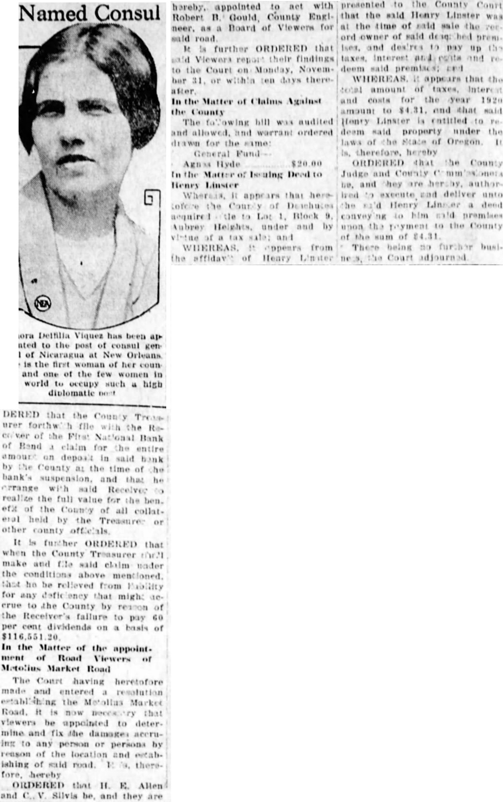 The Court having heretofore made and entered resolution establishing the Metollus Market Road. it is now necessary that viewers be appointed to determine and fix the damages accruIng to any person or persons by reason of the location and estabishing of said road. E therefore. hereby ORDERED that H. E. Alten and Silvis be, and they are hereby, appointed to act with Robert B. Gould, County Englneer. as a Board of Viewers for said road. It is further ORDERED that said Viewers report their findings to the Court on Monday, Novemher 31, or within ten days thereafter. In the Matter of Claims Against the County The following bill was audited and allowed. and warrant ordered drawn for the same: General Fund Agnes Hyde $20.00 in the Matter of Issuing Deed to Henry Linster acquired the to Lot 1, Block 9. Aubrey Heights. under and by virtue of a tax sale: and the affidav's of Henry Limiter presented to the County Court that the said Henry Linster was at the time of said sale the yee ord owner of said desq: hed prem. Ises, and desires to pay up the deem said premises; and WHEREAS. и appears that the and costs for the year 1920 amount to $4.31. and that said Honry Linster is entitled to Pe deam said property under the laws of the State of Oregon. " ORDERED that the County Judge and County mm/astonera Ired to execute and deliver unto convey nk to him mid premises upon the payment to the County of the sum of $4.31. There being no further busithe Court adjourned