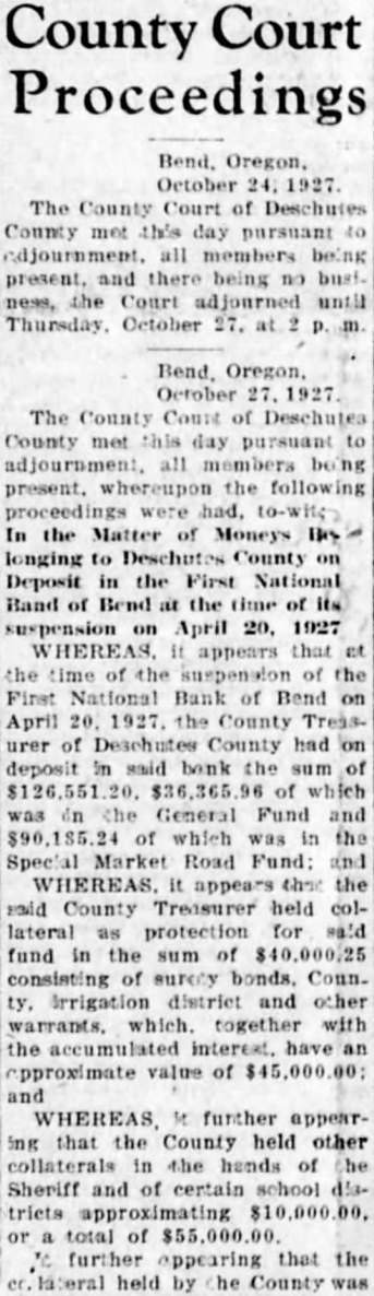 Bend. Oregon. October 27. 1927. The County Count of Deschutes County met this day pursuant to adjournment, all members being present. whereupon the following In the Matter of Moneys By longing to Deschutes County on Deposit in the First National Band of Bend at the time of its suspension on April 20, 1927 WHEREAS. It appears that et the time of the suspension of the First National Bank of Bend on April 20. 1927. the County Treasurer of Deschutes County had on deposit in said bank the sum of $126,551.20. $36,365 96 of which was in the General Fund and $90,185.24 of which was in the Special Market Road Fund: and WHEREAS. it appears the the said County Treasurer held collateral as protection for said fund in the sum of $40,000.25 consisting of surely bonds. County, irrigation district and other warrants, which. together with the accumulated interest. have an approximate value of $45,000. 00: and WHEREAS, M further appearing that the County held other collaterals in the hands of the Sheriff and of certain school disor a total of $55,000.00. TO further appearing that the co.laberal held by he County was