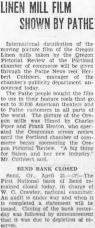 International distribution of the moving picture film of the Oregon Linen mills taken by the Oregon Pictorial Review of the Portland chamber of commerce will be given through the Pathe News reel HerCuthbert. manager of the chamber's publicity department announced today The Pathe people bought the film use in their feature reels that theaters Pathe in all parts world. The picture the Oremills was filmed Charles Piper and Frank Heaton who operthe Oregonian screen review until Portland chamber of commerce began sponsoring the OrePictorial big thing Salem and her new industry.' Cuthbert