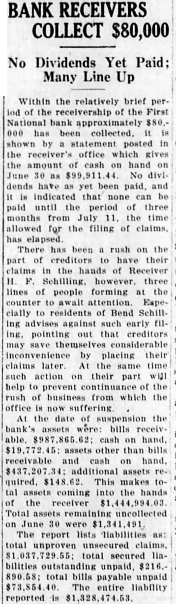 Within the relatively brief perlod of the receivership of the First National bank approximately $80.000 has been collected. it shown by statement posted in the receiver's office which gives the amount of cash on hand on June 30 as No dividends have as yet been paid, and indicated that none can be paid until the period of three months from July 11. the time allowed for the filing of claims, has elapsed. There has been rush on the part of creditors to have their claims in the hands of Receiver three lines of people forming at the counter to await attention Especially to residents of Bend Schilling advises against such early ing. pointing out that creditors may save themselves considerable inconvenience by placing their claims later. At the time same such action on their part will help to prevent continuance of the rush of business from which the now suffering At the date of suspension the bank's assets bills were: receivcash on assets other than bills receivable and cash on additional assets This makes toassets coming into the hands the receiver Total assets remaining uncollected June 30 were The report lists liabilities total unproven unsecured claims. total secured liabilities outstanding unpaid, total bills payable unpaid The entire liability reported
