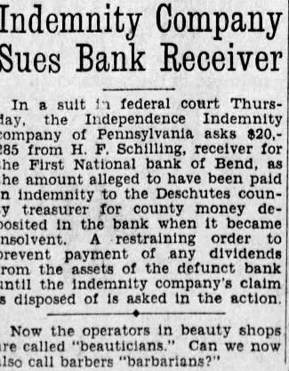 In a suit in federal court Thursday, the Independence Indemnity company of Pennsylvania asks $20,285 from H. F. Schilling, receiver for the First National bank of Bend, as the amount alleged to have been paid in indemnity to the Deschutes county treasurer for county money deposited in the bank when it became insolvent. A restraining order to prevent payment of any dividends from the assets of the defunct bank until the indemnity company's claim is disposed of is asked in the action.
