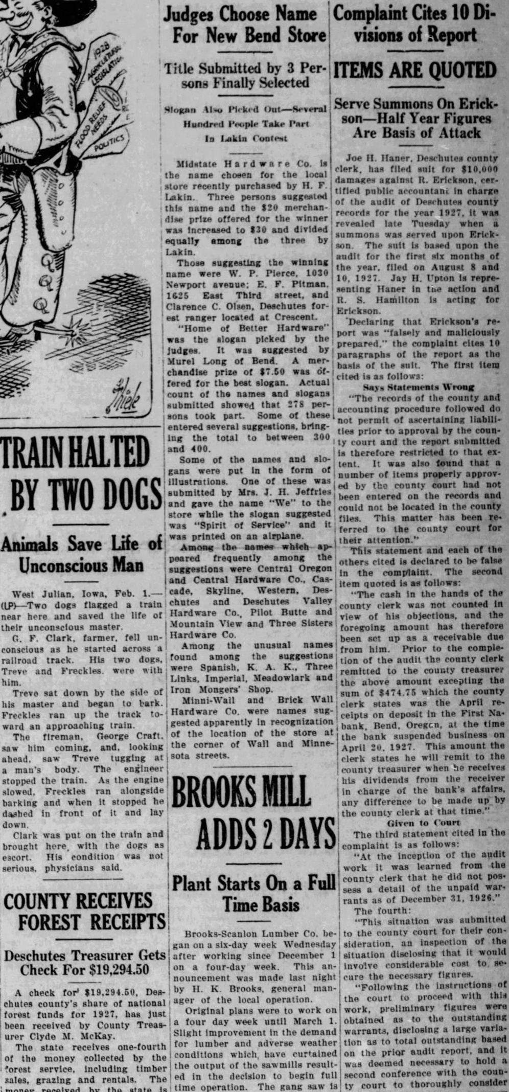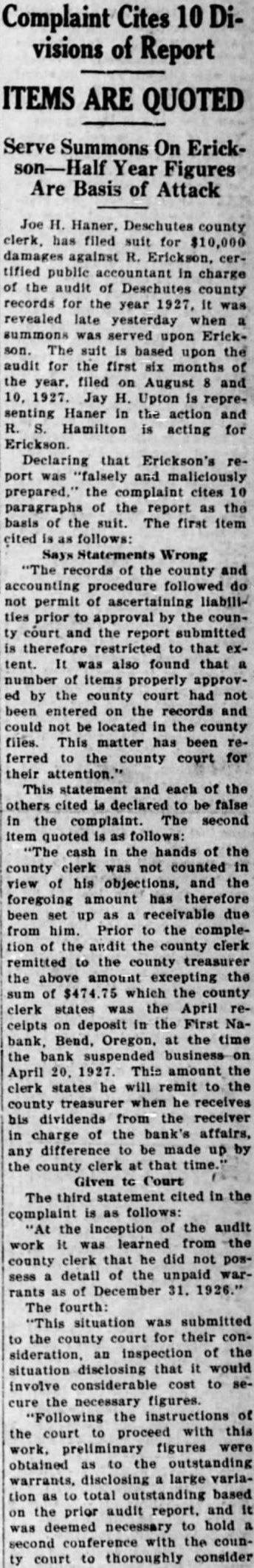 Joe H. Haner. Deschutes county clerk, has filed suit for damages against Erickson, certified public accountant in charge of the audit of Deschutes county records for the year 1927, It revealed late yesterday when summons was served upon Erickson. The suit based upon the audit for the first six months of the year. filed on August and 10. 1927. Jay H. Upton is representing Haner in the action and Hamilton is acting for Erickson. Declaring that Erickson's port was "falsely and maliciously prepared,' the complaint cites 10 paragraphs of the report as the basis the suit. The first item cited follows: Says Statements Wrong records of the county and accounting procedure followed do not permit of ascertaining liabilities prior to approval by the councourt and the report submitted therefore restricted to that extent. It was also found that number of items properly approvby the county court had not been entered on the records and could not be located in the county files. This matter has been referred to the county court for their attention." This statement and each of the others cited declared to be false in the complaint. The second item quoted is follows: cash in the hands of the county clerk was not counted in view of his objections, and the foregoing amount has therefore been up as receivable due from him. Prior to the completion of the andit the county clerk remitted the county treasurer the above amount excepting the of which the county clerk states was the April receipts on deposit in the First Nabank, Bend, Oregon, at the time the bank suspended business April 1927. This amount the clerk states he will remit the county treasurer when he receives his dividends from the receiver in charge of the bank's any difference to be made up the county clerk at that Given Court The third statement cited in the complaint is follows: the inception of the audit work was learned from the county clerk that he did not possess detail of the unpaid warrants of December 31. The fourth: "This situation was submitted to the county court for their consideration, an inspection of the situation disclosing that it would involve considerable cost to secure the necessary figures. "Following the instructions of the court to proceed with this work. preliminary figures were obtained to the outstanding warrants, disclosing large tion as to total outstanding based the prior audit report. and It was deemed necessary to hold second conference with the councourt to thoroughly consider