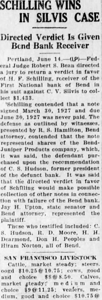 Pertland, June eral Judge Robert S. Bean directed jury to return a verdict in favor of H. F. Schilling. roceiver of the First National bank of Bend in his suit against C. V. Silvis to collect Schilling contended that a note signed March 30, 1927 and due June 30, 1927 was never paid. The defense as outlined by witnesses, presented by R. S. Hamilton, Bend attorney. contended that the note represented shares of the BendJuniper Products company. which, it was said, the defendant purchased upon the recommendation of C. S. Hudson, former president of the defunct bank. It was said that the directed verdict in favor of Schflling would make possible collection other notes in connection with failure of the Bend bank. Jay H. Upton, state senator and Bend attorney. represented the plaintiff. These who testified included: C. S. Hudson. R. D. Moore. H. H. Dearmond. Don H. Peoples and Hiram Norton. all of Bend.