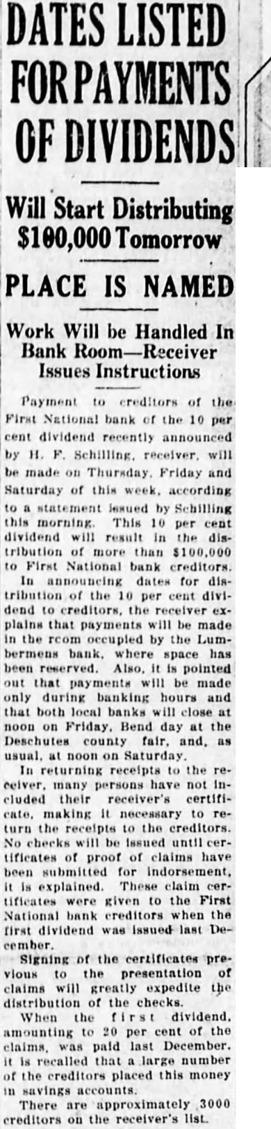Payment creditors of the National bank of the 10 per dividend recently announced made Thursday. Friday and Saturday of this week. according statement issued Schilling this morning This 10 per cent dividend will result in the distribution of more than First National bank creditors. In announcing dates for tribution of the 10 per cent dividend creditors, the plains that payments will be made the rcom occupied by the Lumbermens bank. where space has been reserved. Also, pointed that payments be made only during banking hours and that both local banks close at noon on Friday. Bend day at the Deschutes county fair. and, usual. noon Saturday In returning receipts to the ceiver. many persons have not Included their receiver's making necessary to turn the receipts to the creditors. checks will be Issued tificates of proof of claims have been submitted for indorsement, explained. These claim tificates were given to the First National bank creditors the first dividend last cember. Signing the certificates vious the presentation of claims will greatly expedite distribution of the checks. When the dividend. amounting to 20 per cent of the paid last December. recalled that large number the creditors placed this money accounts. There are approximately 3000 creditors on the receiver's list.