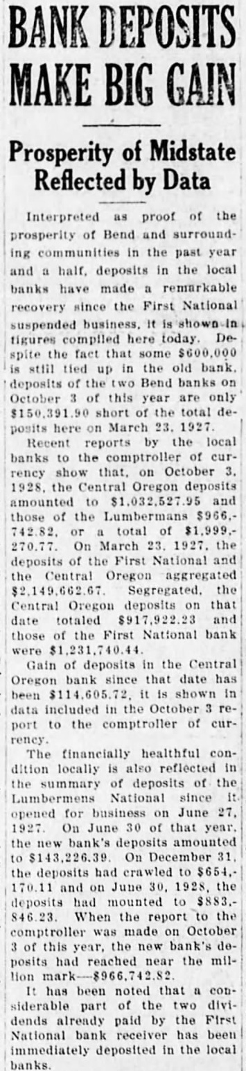 Interpreted proof of the prosperity of Bend and surrounding communities in the past year in the local and deposits banks have made remarkable recovery since the First National suspended business. It tigures complled here today. Despite the fact that some still tied in the old bank. up deposits of the Bend banks on October of this year are only short of the total deposits here on March 23. 1927 Recent reports by the local banks to the comptroller of currency show that, on October 1928. the Central Oregon deposits amounted to and those of the Lumbermans $966.or total of 270.77. On March 23. 1927. the deposits of the First National and the Central Oregon aggregated Segregated. the Central Oregon deposits on that date totaled and those of the First National bank Gain of deposits in the Central Oregon bank since that date has been shown in included in the October report to the comptroller of currency. The financially healthful condition locally is also reflected in the summary of deposits of the Lumbermens National since opened for business on June 27, 1927 On June 30 of that year. the new bank's deposits amounted to $143,226.39. On December 31. the deposits had crawled to $654.and on June 30. 1928, the deposits had mounted to $883.When the report to the comptroller was made on October of this year, the new bank's deposits had reached near the million has been noted that considerable part of the two dividends already paid by the First National bank receiver has been immediately deposited in the local banks.